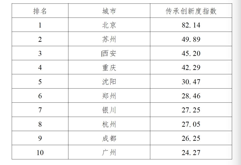 “中国古都城市传承创新度”榜单从政策支持度和文化活力值两个方面,反映了我国古都城市对承托其国际影响力的文化资源的重视程度和工作力度,体现了我国古都城市开展文化遗产保护传承与文化弘扬创新、发展文化产业的能力与水平。从榜单表现来看,我国古都城市传承创新度与古都城市国际影响力相关特征明显,该榜单位居前十的古都城市中有7个进入了总榜单的前十名。同时,我国古都对文物、文化资源的传承创新程度差异较大,榜单首尾指数数值差异较大;而榜单后六位间差值较小,整体传承创新程度偏低。其中,除北京外,居于榜单第二位的苏州在文化遗产保护政策、文化产业支持政策、文化遗产资源保有量以及文化创新活力等方面也有较高水平、较均衡表现。