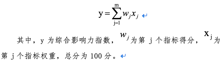 本报告数据采自闻海大数据平台,抓取我国古都城市在国际传统媒体和网络媒体(含网站、电子报纸、脸书、推特、优兔)的传播数据,结合我国古都城市在文化遗产保护传承方面的相关数据(含古都城市拥有的世界遗产数量、物质与非物质文化遗产的保有情况、博物馆等文化设施的建设水平、城市文化遗产保护开发的相关政策数量、谷歌学术平台古都城市相关研究的文献量、古都城市文化标识和旅游目的地在国际旅游网站上的评分情况等),评估我国古都城市在国际融合、传承创新、文化传播、品牌传播、城市形象五个维度上的表现。各个维度通过指数量化呈现,综合指标的计算采用线性加权综合评价模型,即对各指标进行线性加权求和,从而得到综合评价指数,公式如下: