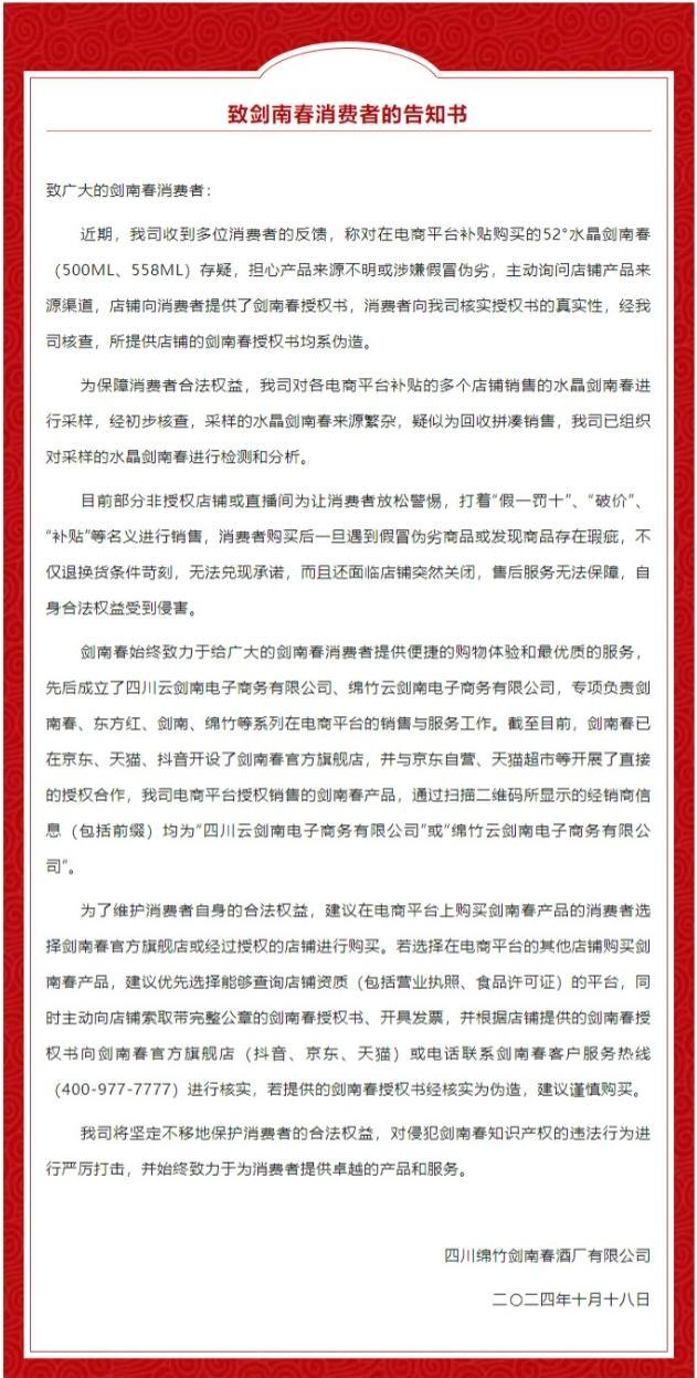 在《告知书》中,剑南春称,近期收到多位消费者反馈,对在电商平台补贴购买的52°水晶剑南春(500ML、558ML)存疑,担心产品来源不明或涉嫌假冒伪劣。经剑南春核查,该电商平台所提供的剑南春授权书系伪造,产品并非其授权产品。