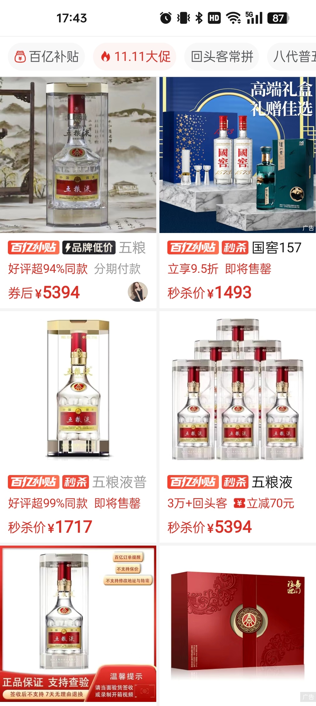 记者走进成都春熙路某商超发现,第八代五粮液一瓶售价近千元,但在某电商平台推出补贴、秒杀等优惠政策后,两瓶第八代五粮液售价仅为1700多元。该商超负责人告诉记者,临近“双十一”线上平台推出补贴力度太大,经常有消费者来线下渠道询价,结果他们发现线上渠道产品显然更有性价比。