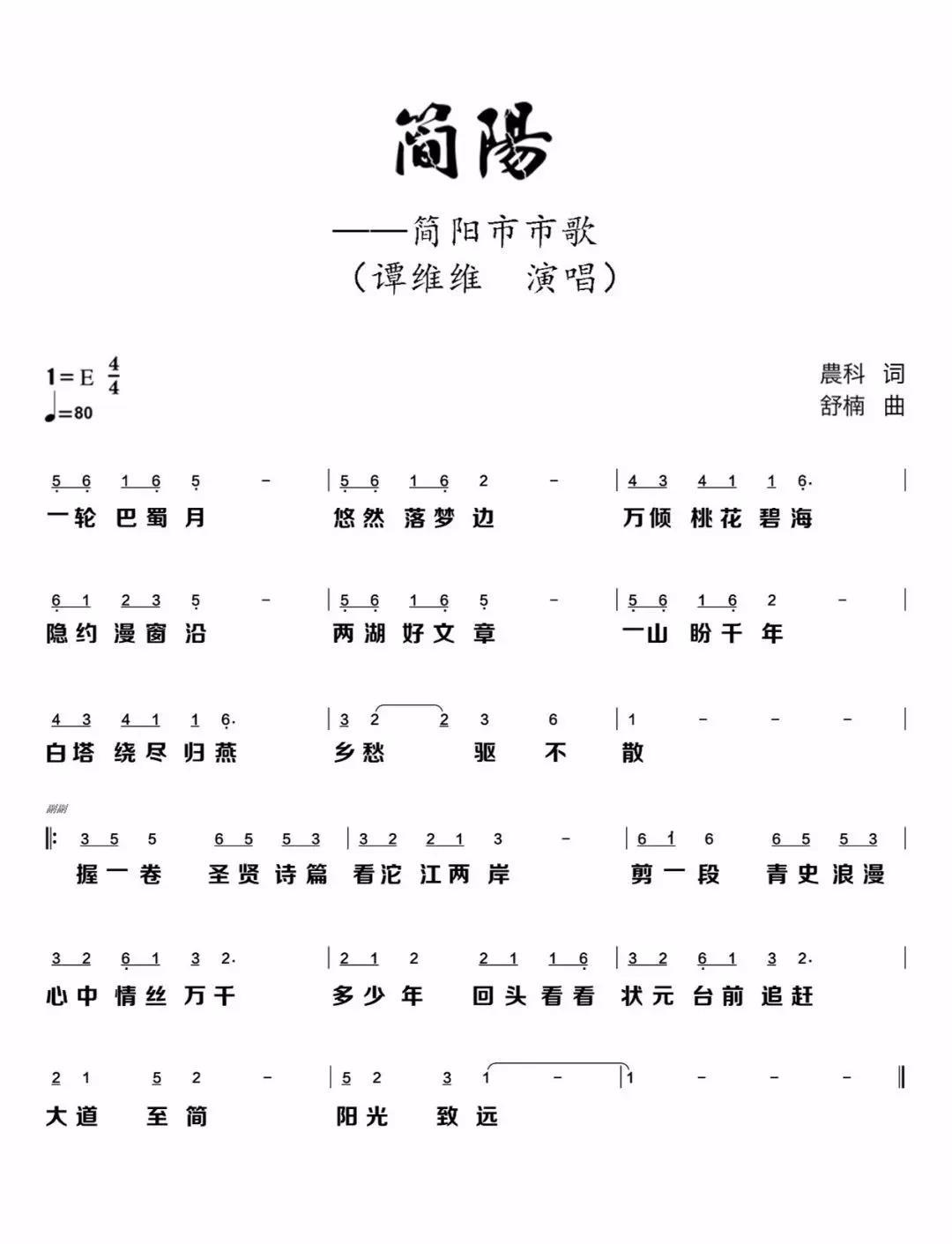 音乐特色:大道至简,阳光致远。悠扬动听的旋律,展现了雄州简阳抢抓东进机遇的热情;简单朴实的歌词,谱写了简阳人民推进三大转型的豪情;谭维维用豪迈高亢的歌喉,唱响了雄州儿女建设三新简阳的决心。