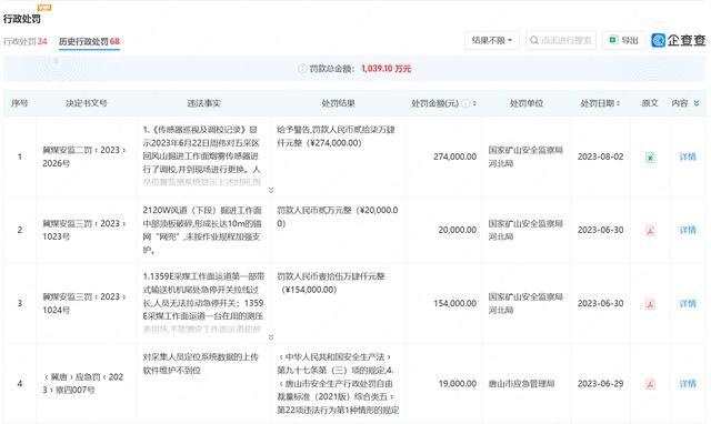 企查查APP显示,开滦(集团)有限责任公司钱家营矿业分公司因安全相关问题,被有关部门罚款高达一千余万元。今年6月,该矿因存在顶板等问题被罚33.8万元。