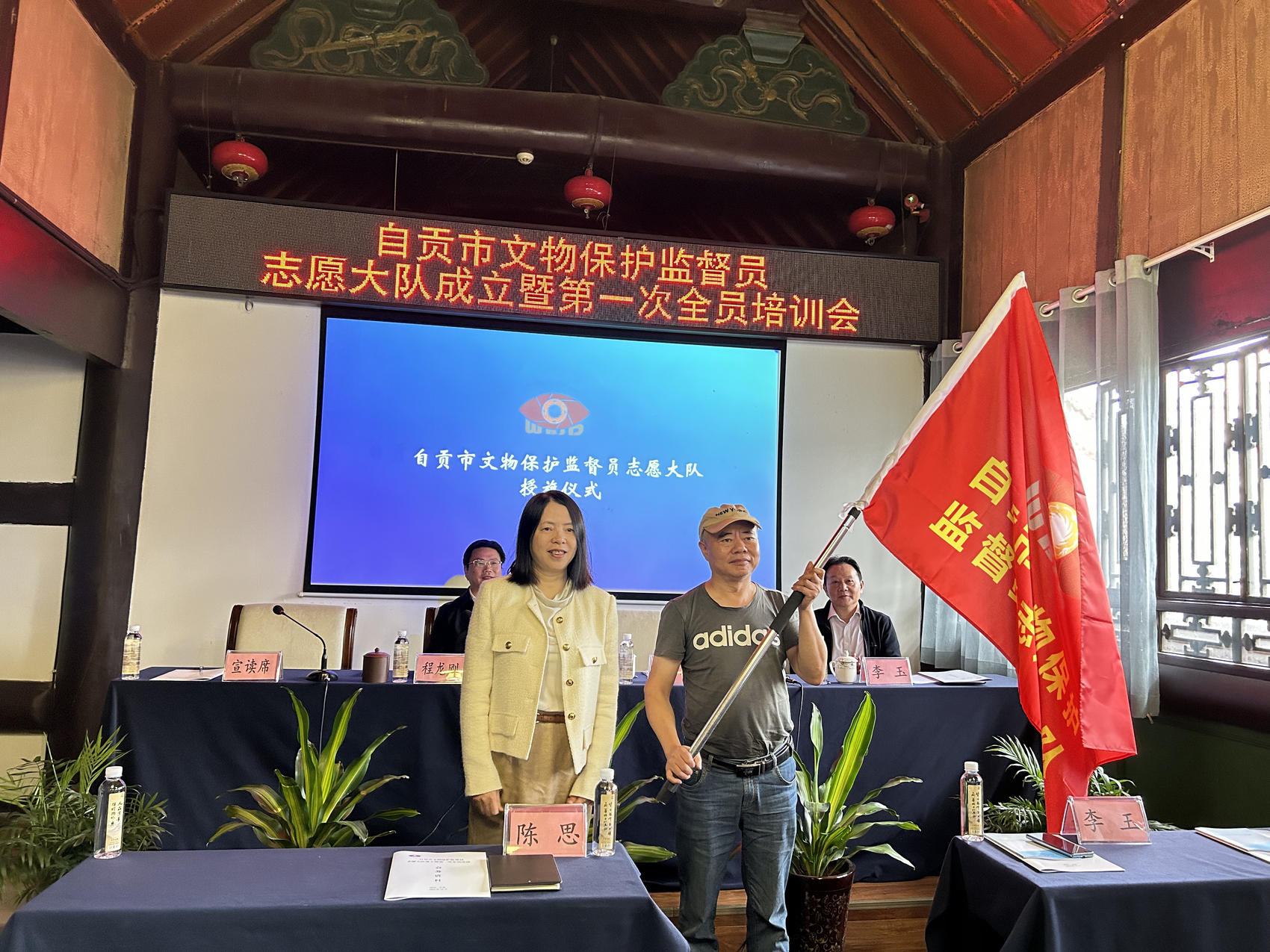 当天,自贡市文物局、各相关单位以及自贡市文物保护监督员志愿大队的队员们齐聚一堂,共同见证这一重要时刻。会上,自贡市文物局工作人员郑重宣读《自贡市文物保护监督员管理办法》,汇报了自贡市文物保护监督员志愿大队成立工作情况,并为自贡市文物保护监督员志愿大队授旗。