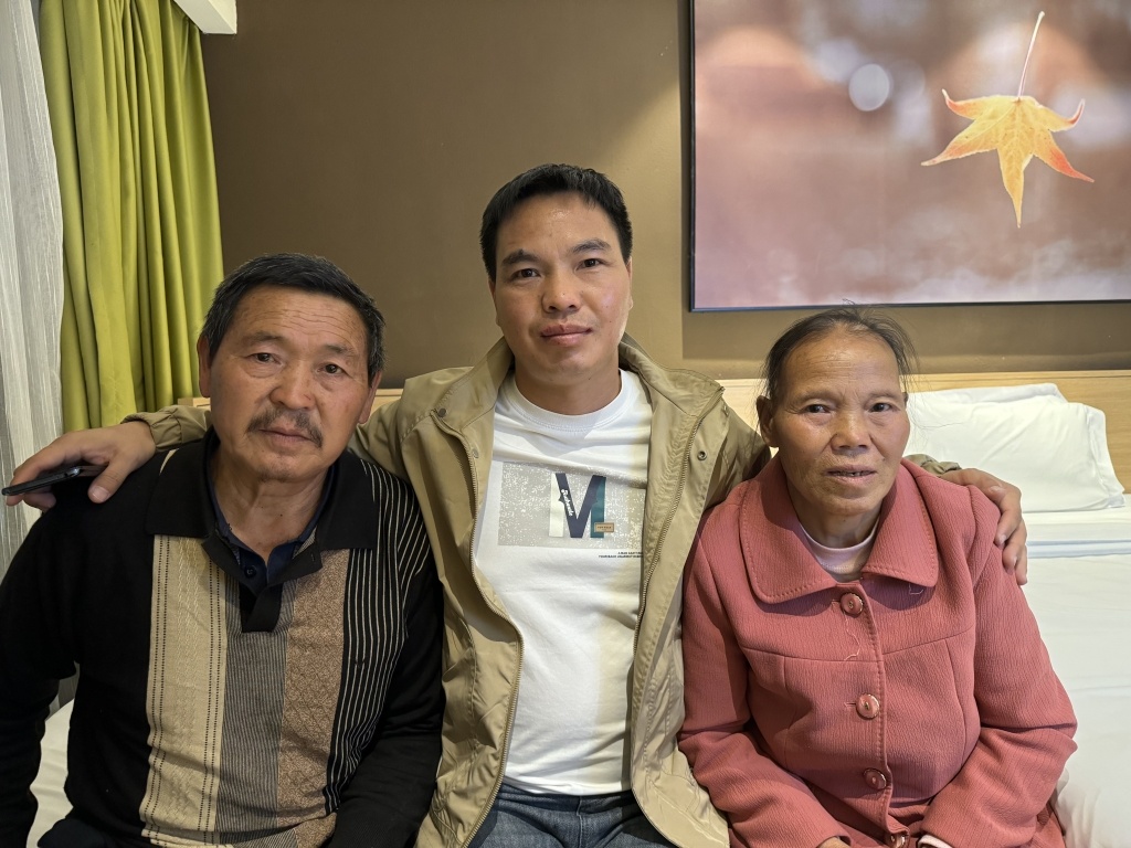 10月24日晚,谌江海(中)与亲生父母一起来到贵阳,准备前往贵阳中级法院参加余华英拐卖儿童案宣判。澎湃新闻记者 王鑫 图