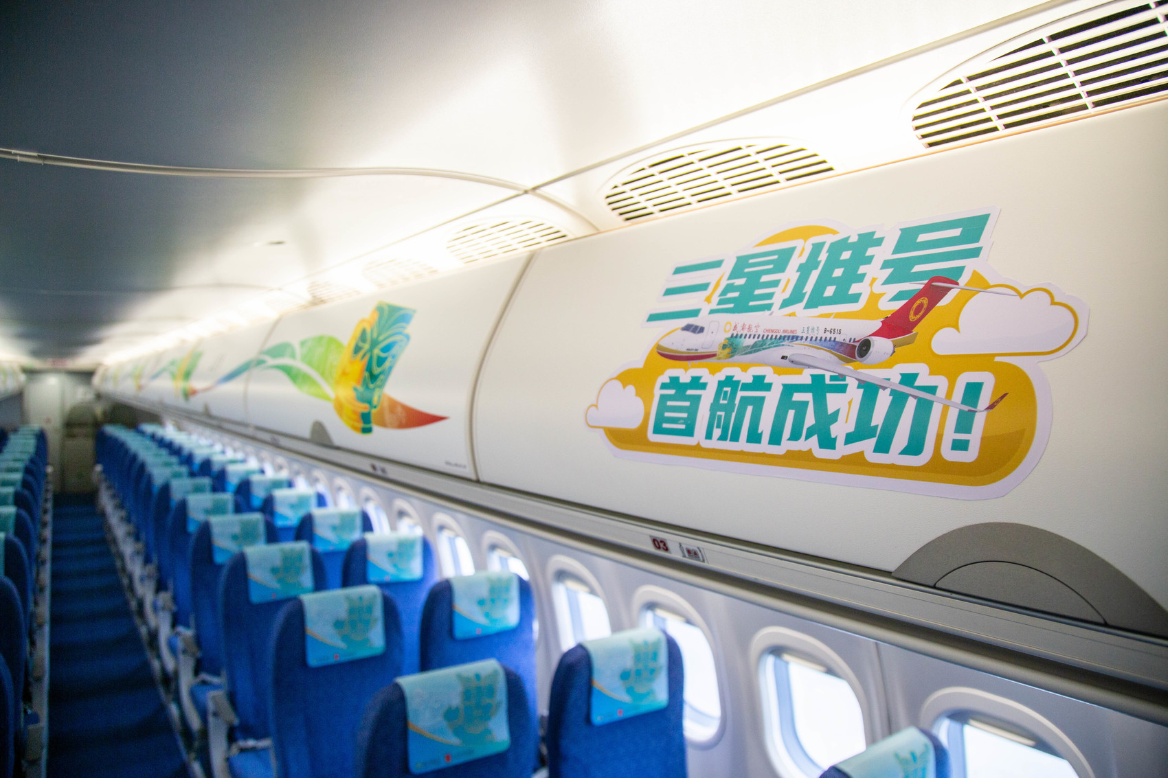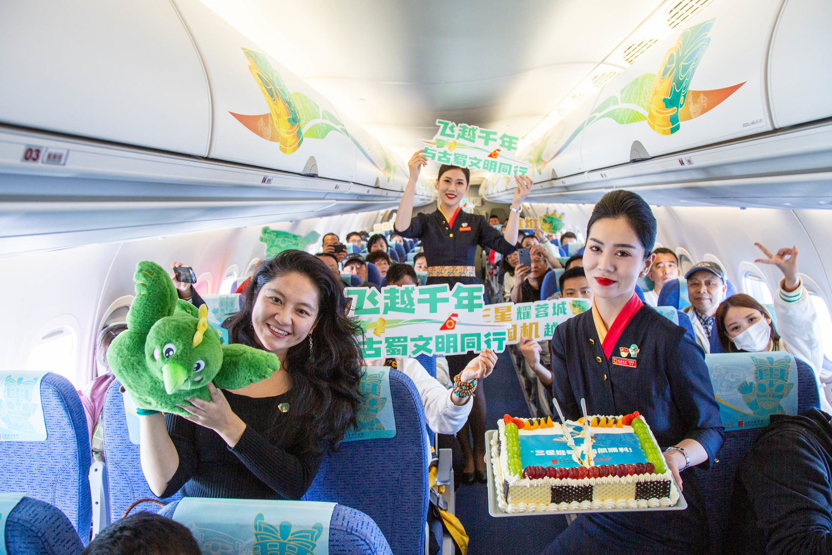首飞航班从成都双流国际机场起飞,客舱内布置了三星堆主题座椅头片、行李架及小桌板。首航航班乘务组为旅客科普三星堆文化、开展三星堆主题趣味问答、并赠送由三星堆博物馆及成都航空提供的文创产品,让旅客近距离感受古蜀文明的魅力。旅客们还与机组人员共同切下首飞蛋糕,合影留念,共同庆祝这一时刻。