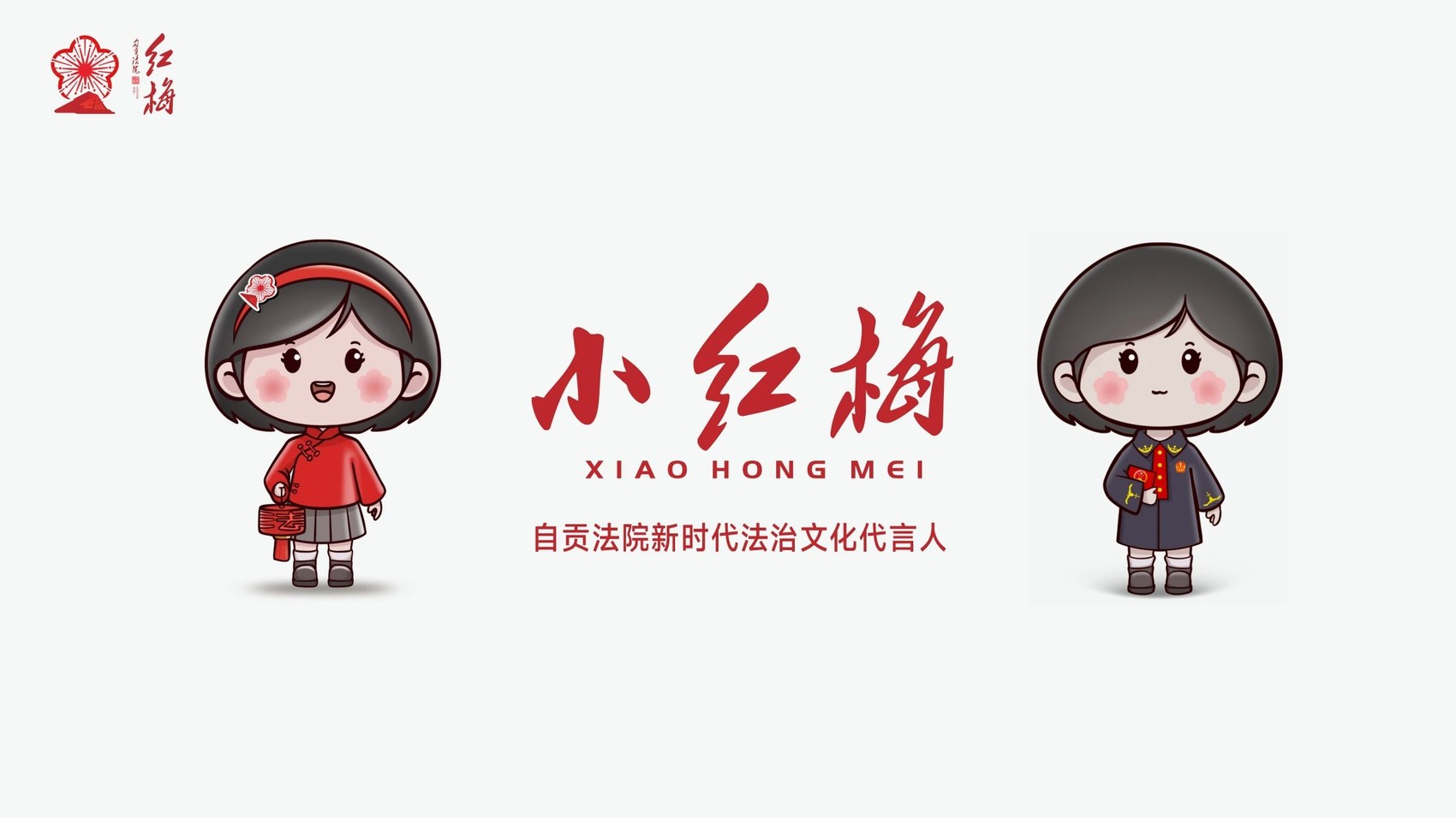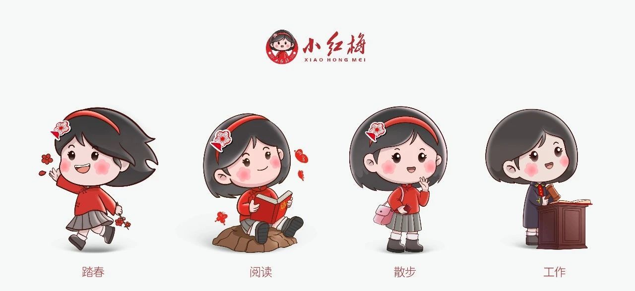 如果说红梅是江姐精神品格的具化象征,那么“小红梅”就是红梅的IP人物化身,是自贡中级人民法院新时代法治文化代言人。“小红梅”身着代表传统文化的斜襟盘扣服饰和围巾,头戴具有“红梅”文化标识的创意发夹,手提蕴含彩灯文化和法治文化的创意灯笼。整个IP自信、坚毅、亲民,充满活力与生命力。同时,结合工作、生活多场景还设计出不同形态的“小红梅”。