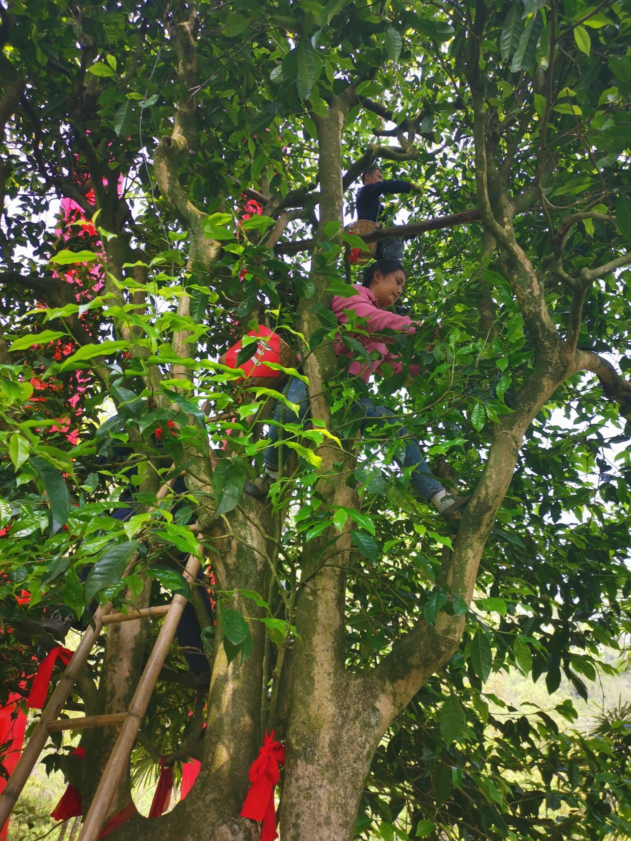 工人正在采摘枇杷茶千年古茶树鲜叶。
