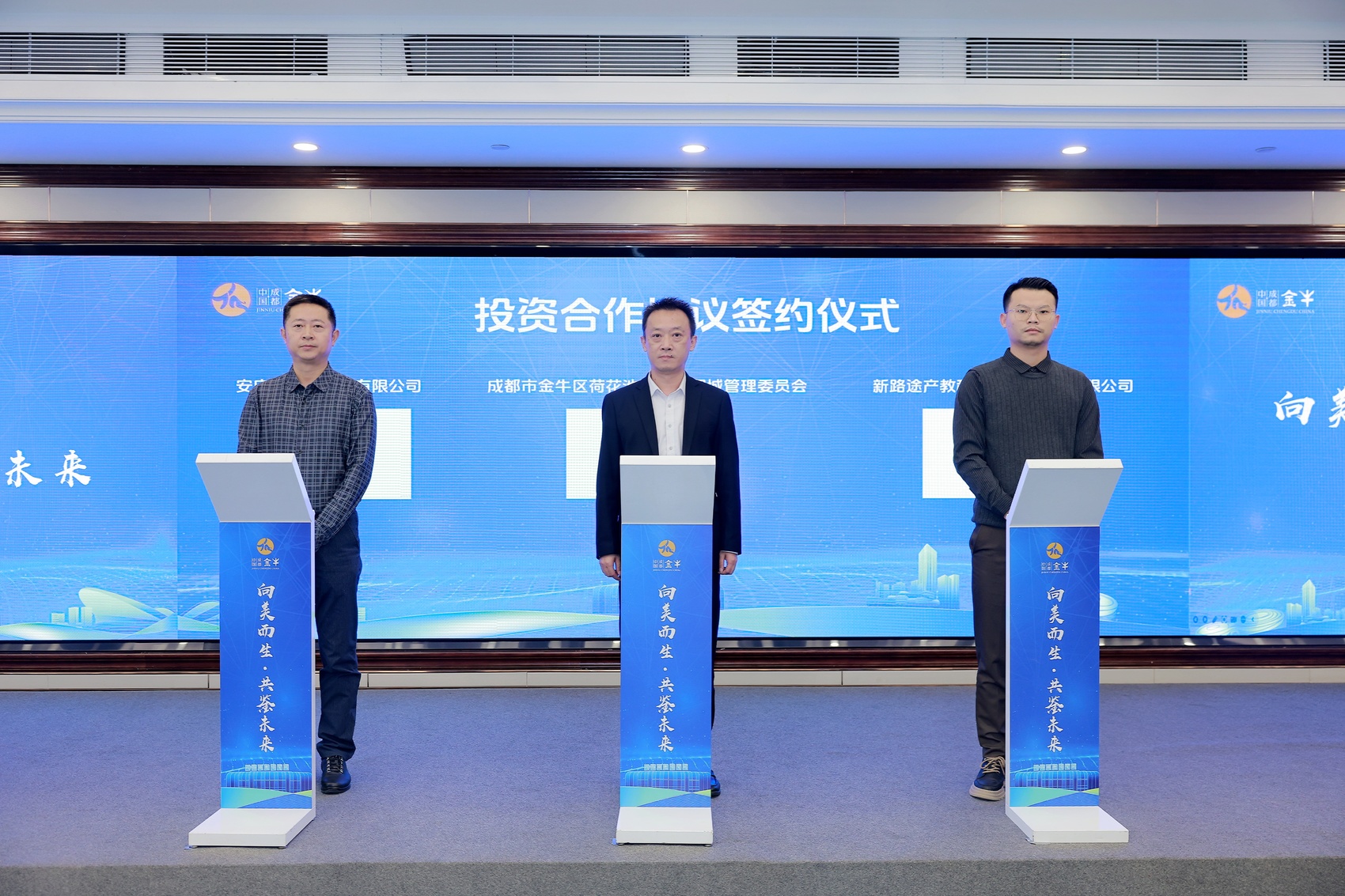 活动现场,成都市金牛区荷花池国际商贸城管理委员会分别与安庆帝雅艺术品有限公司、新路途产教科技(成都)集团有限公司签署了投资合作协议,为凤凰未来新城文旅产业发展注入新的活力。