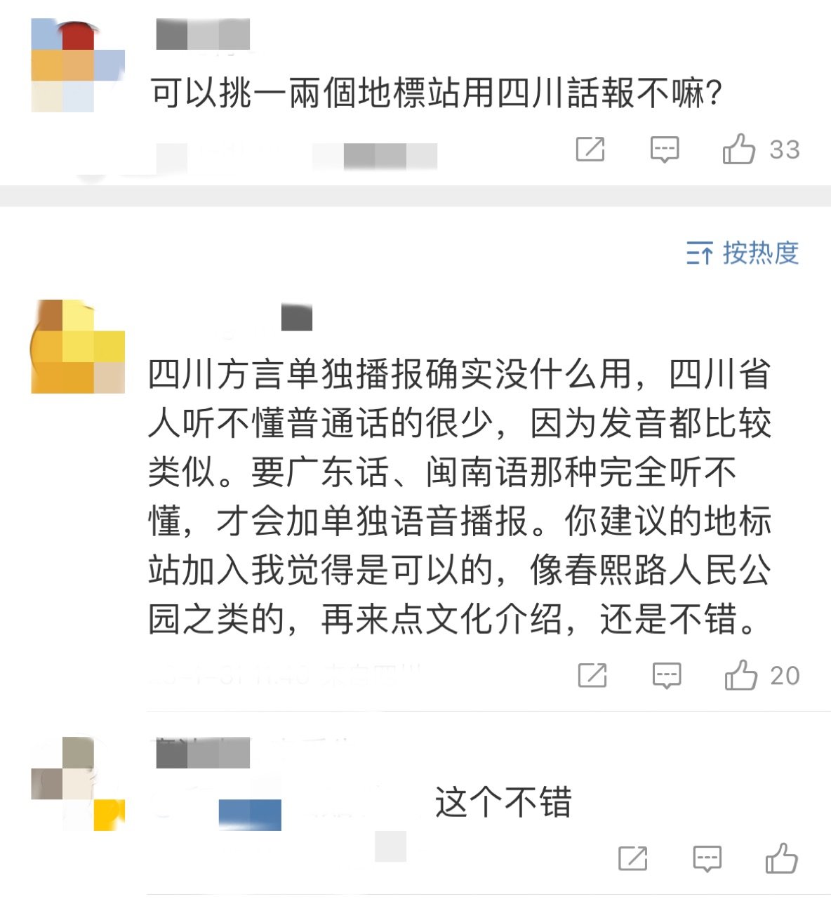 有网友通过四川省网上群众工作平台“问政四川”建议,成都地铁能否开通方言播报,称“此举既能宣传弘扬四川话,又可以加强市民的归属感。”