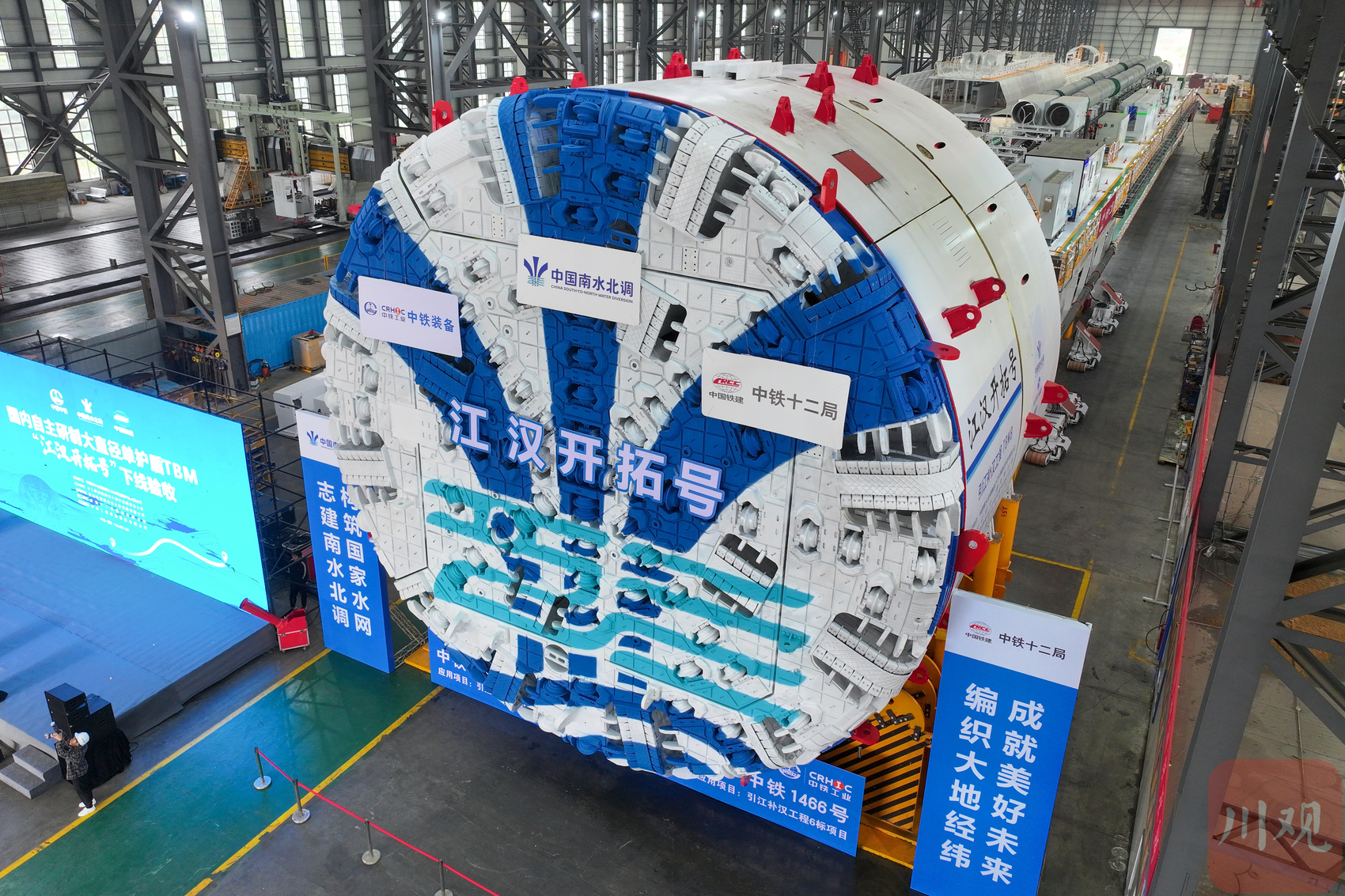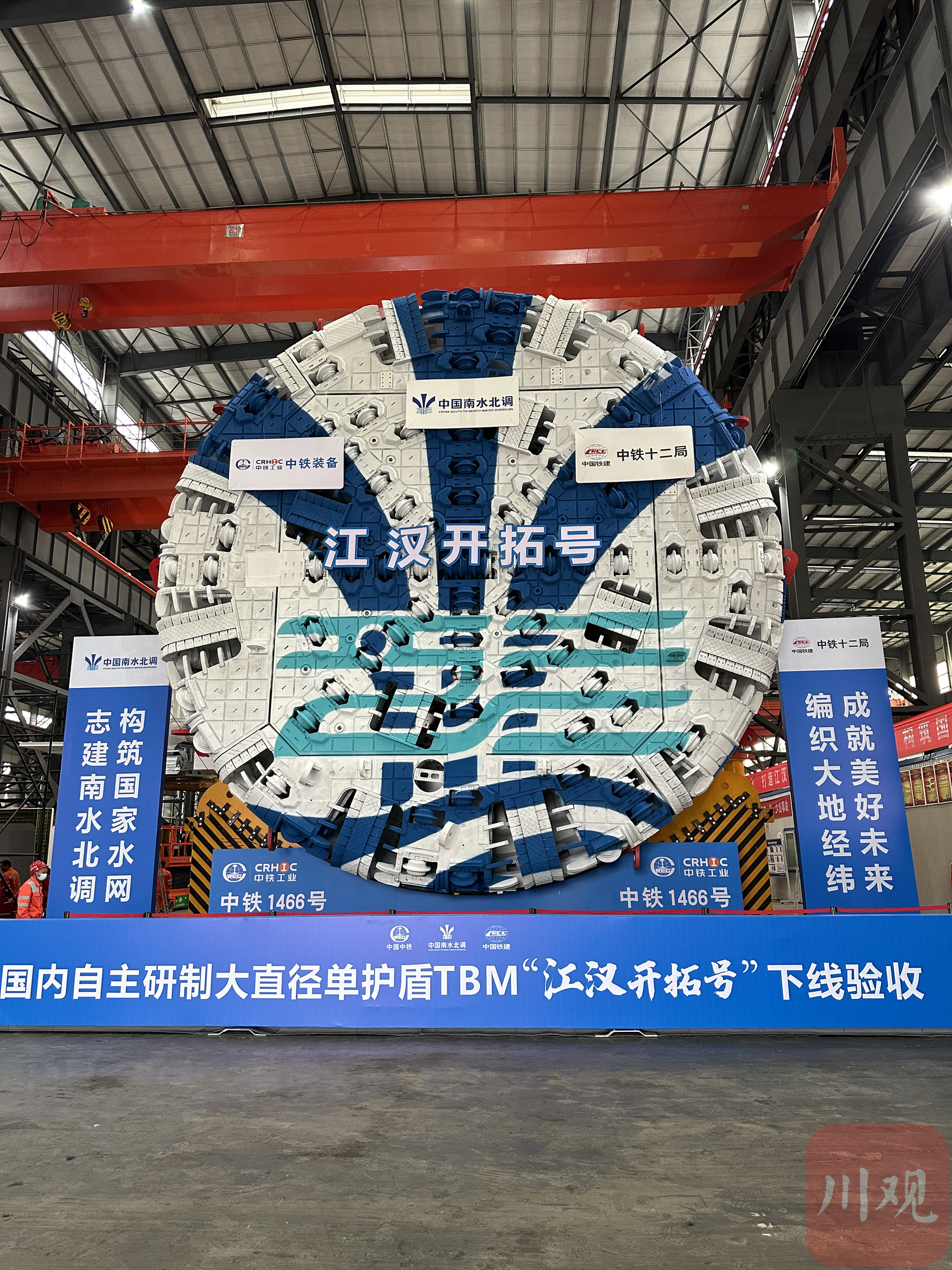 10月28日,由江汉水网公司、中铁十二局、中铁工程装备集团共同研制的南水北调中线引江补汉工程“江汉开拓号”TBM在中铁工程装备集团德阳基地下线,这是国内水利工程应用的最大直径单护盾硬岩掘进机,也是引江补汉工程全线10台TBM中下线验收的首台“四川造”。
