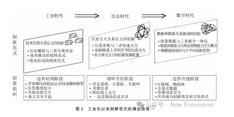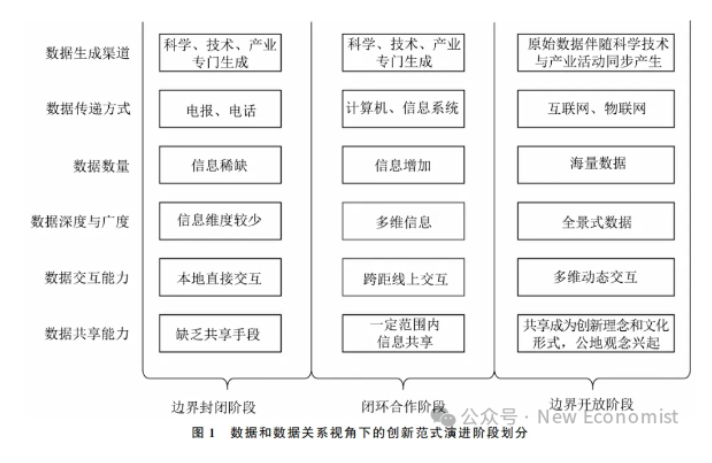 进入21世纪,以互联网、大数据、人工智能为代表的数字技术带来数据生成、 传递和处理能力的极大提升,数据关系重新定义创新链条上各方的交互方式和地位作用,创新要素、创新主体、创新过程和创新组织等方面发生重要改变,这些改变导致数字时代的创新范式呈现出数据和数据关系驱动的新形态。