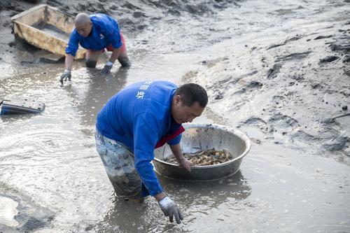 ▲玄滩镇稻虾养殖基地,工作人员在稻田里收虾。记者 何赛格 摄