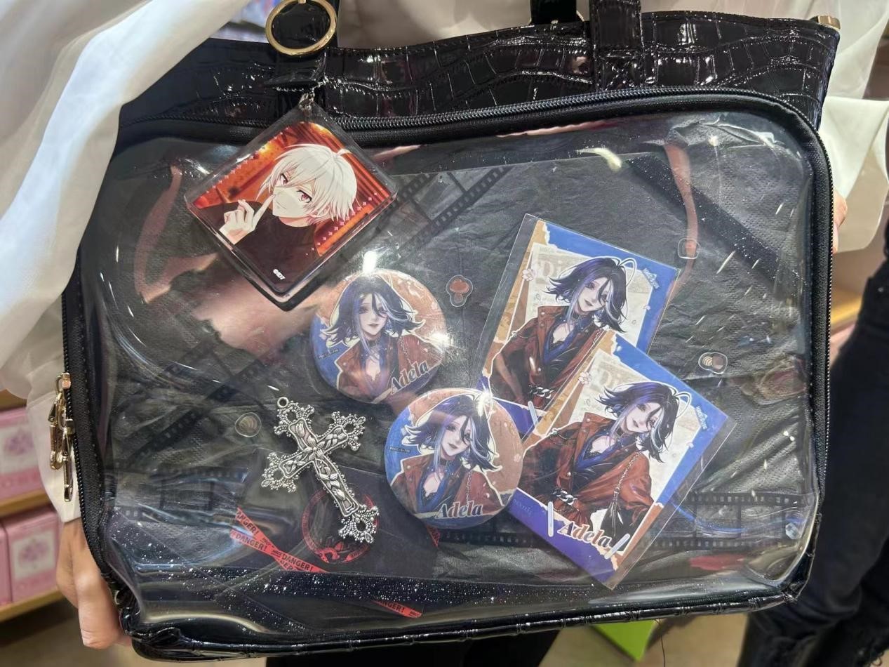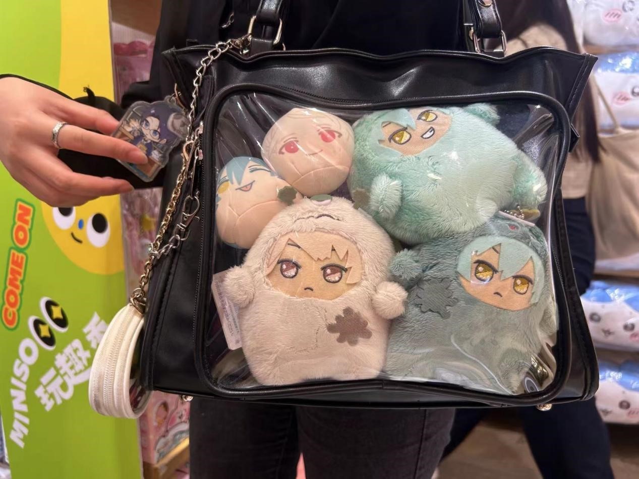 “二次元”对自身品味和价值观的彰显,最为典型的是“痛包文化”。爱好者通过用大量吧唧(徽章)、玩偶、卡片等“二次元”周边固定在包外侧的透明夹层中,以展示个人的喜好和个性。痛包文化的“痛”字,在日语中用来形容一种独特、夸张且引人注目的感觉,类似于“让人眼前一亮”或“独具一格”的意味。因此,痛包往往具有极高的视觉冲击力和辨识度。