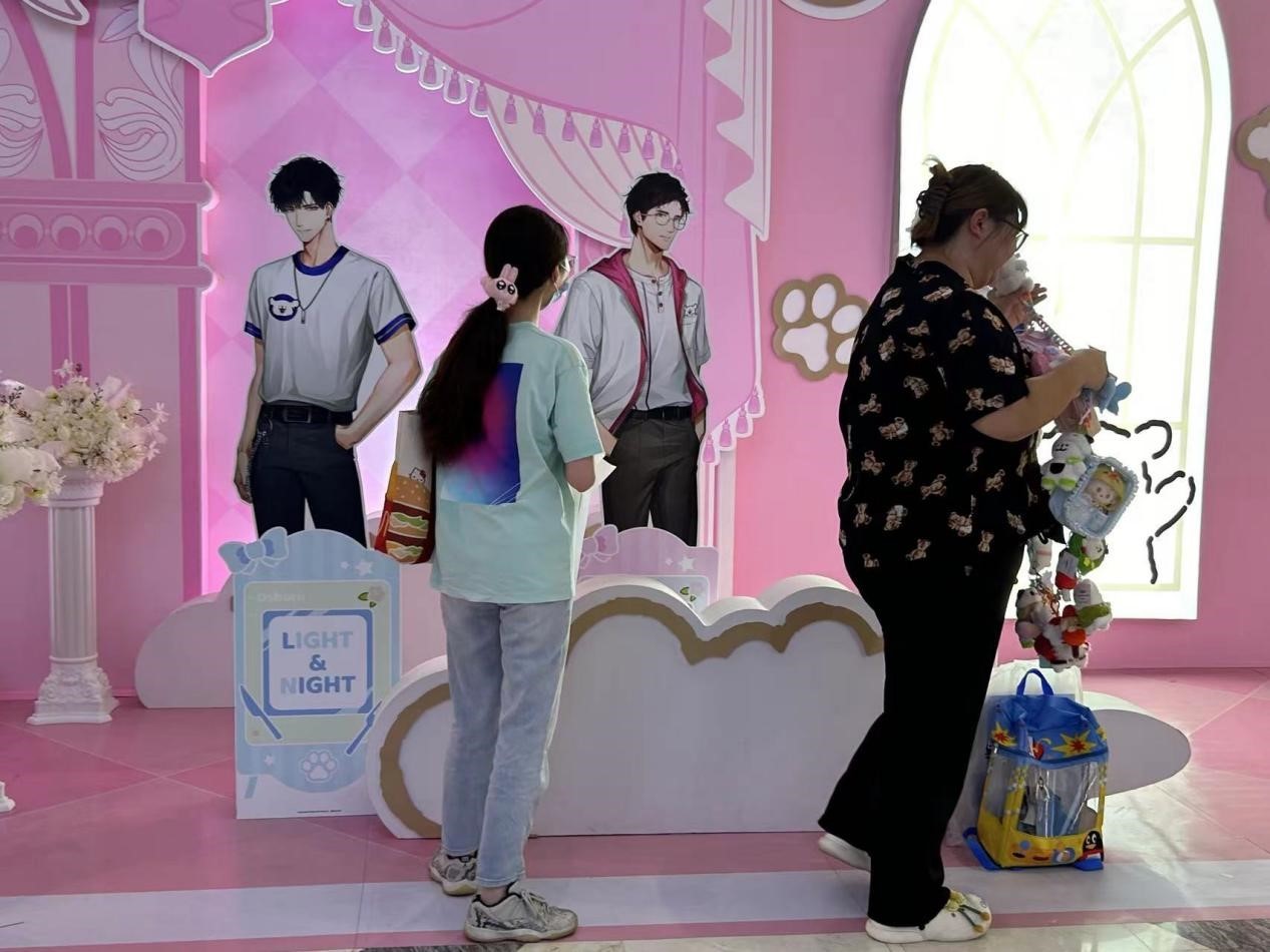 《光与夜之恋》快闪活动现场,右边的“二次元”爱好者拿着一串娃娃,准备与自己喜欢的角色合影。