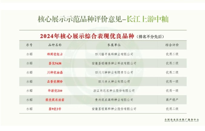 会上,还发布了2024年国家农作物新品种核心展示品种评价结果。经评价,从116个参展品种中评选出了57个优秀品种,包括水稻20个、小麦7个、玉米30个。其中,四川丰大种业有限公司生产经营的“品香优秱珍”综合评价达到优质一级,四川川种种业有限责任公司生产经营的“川种优油晶”综合评价达到优质二级,均入选2024年核心展示综合表现优良品种(长江上游中籼组)。