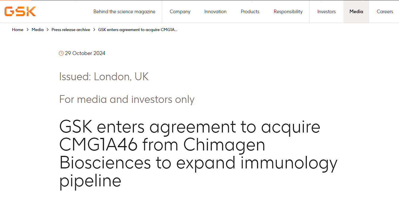 10月29日,知名跨国医药巨头葛兰素史克(GSK)发布公告称,GSK与成都恩沐生物科技有限公司达成收购系统性红斑狼疮创新药的协议,将提前支付3亿美元,从恩沐生物收购CMG1A46—一种临床阶段靶向CD3/CD19/CD20三抗,以获得其全部全球权利。此外,后者将有资格获得相关的开发和商业化里程碑付款,总额为5.5亿美元 。