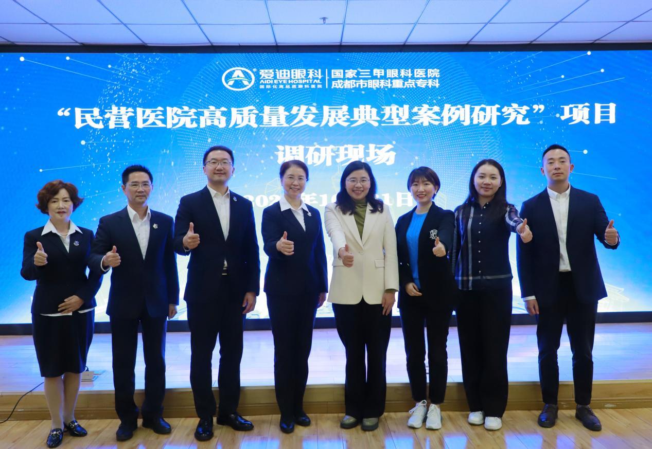 10月31日,由国家卫生健康委医院管理研究所医院评审评价研究部副主任张艳丽带队的“民营医院高质量发展典型案例研究”调研组一行,来到成都爱迪眼科医院考察调研。四川省卫生健康委医疗卫生服务指导中心机构评审评价部主任江媛,四川省医院协会副会长、社会办医分会会长景秀京陪同调研。