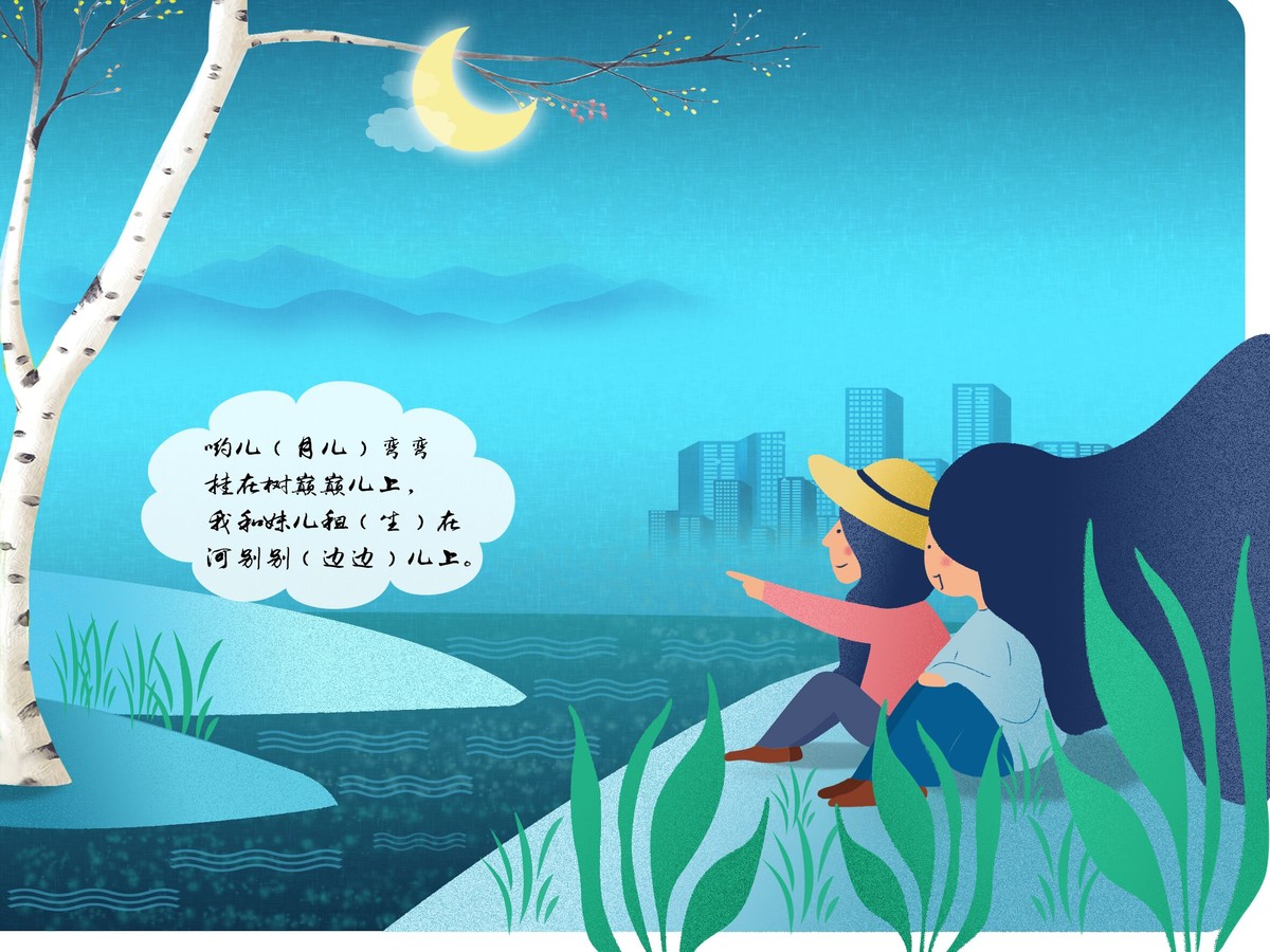 乐山方言:月儿弯弯挂在树巅巅上,我和妹儿坐在河边边儿上。你听懂了吗?李梅 插画