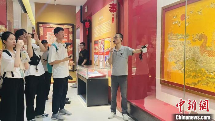 台湾青年何冠奕(右)向游客讲解南京云锦(资料图)。(受访者供图)