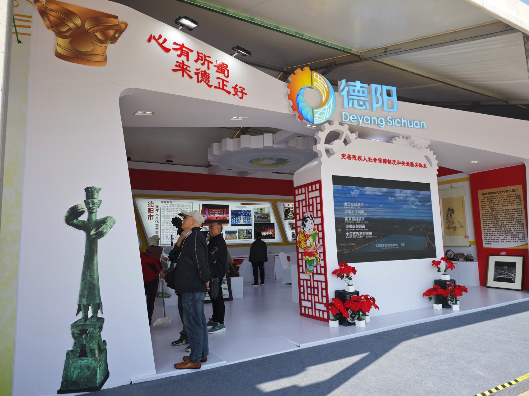 本次文化艺术节,德阳馆设计突出德阳“古蜀之源”“中国装备科技城”的城市名片,融入三星堆、绵竹年画、风力发电等本土文化元素,充分彰显了德阳深厚的文化底蕴和蓬勃的发展气象。馆内设有残疾人手工艺及书画作品展区、手工制作演示区、直播带货区等,汇集由德阳籍残疾人制作的剪纸、掐丝、根雕、皮雕、面塑等作品(产品)百余件。