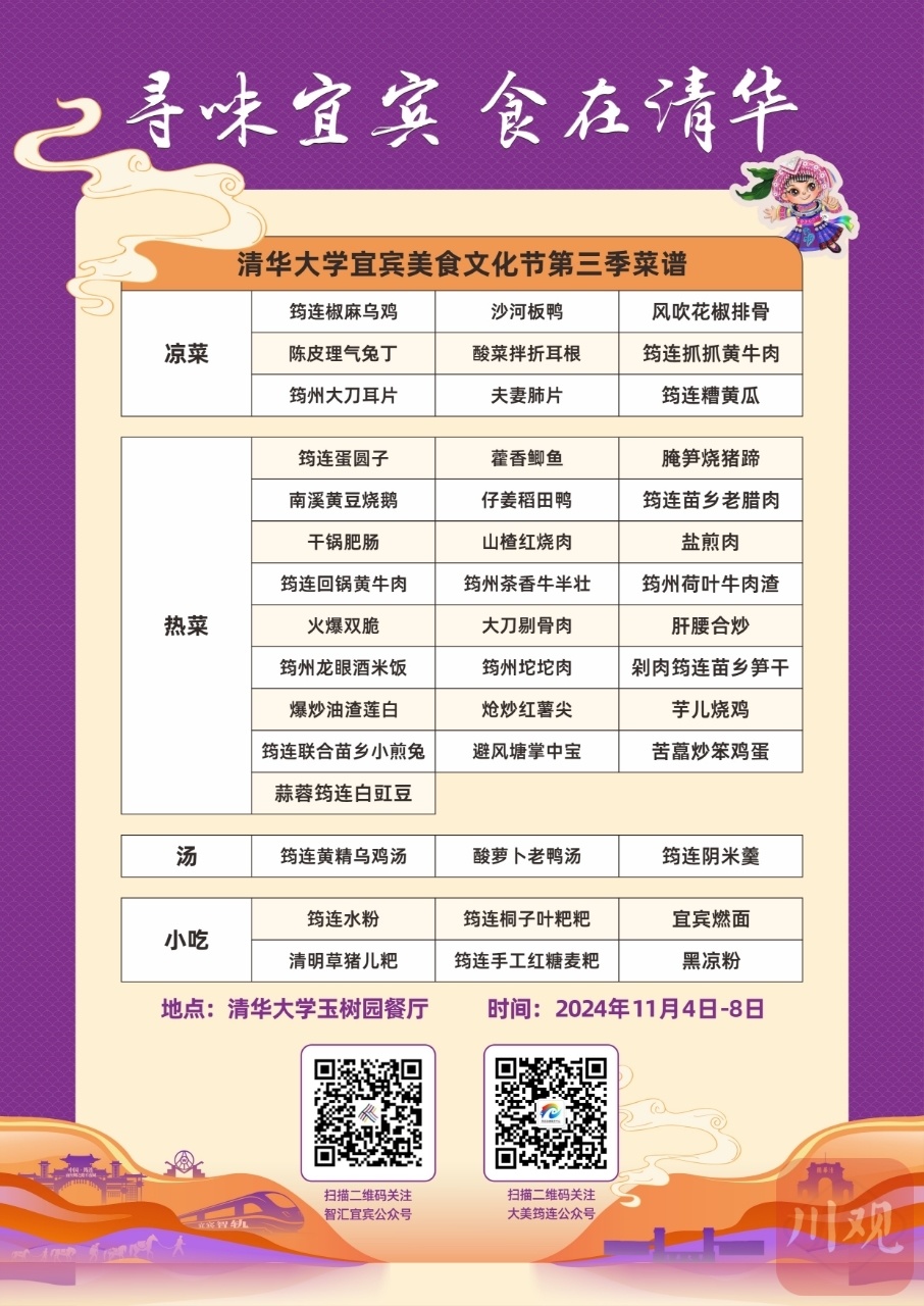 筠连椒麻鸡、筠连蛋圆子、筠连水粉、黄精乌鸡汤......11月4日,川观新闻从筠连县委组织部获悉,继去年的宜宾清华美食文化周之后,11月4日至8日,以“寻味宜宾·食在清华”为主题的清华大学宜宾美食文化节第三季在清华大学玉树园餐厅举行。43道宜宾和筠连特色美食亮相清华大学,为清华师生带来一场地道的宜宾风味体验。