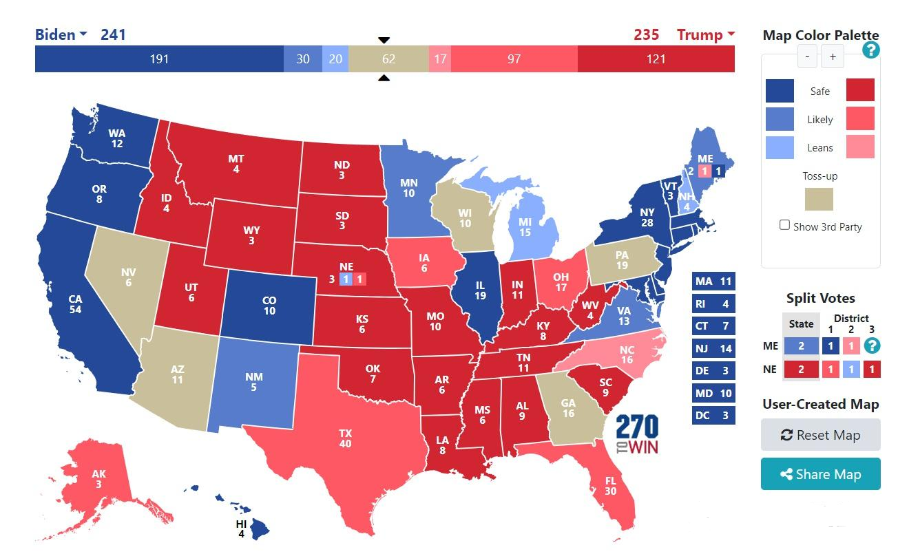 过往四届的美国大选中,连续获得选举人选票的州,会被民主党和共和党视为自己的固定票仓。目前来看,这些票仓数量都无法达到270张以上,所以没有哪个党可以在大选中稳赢。