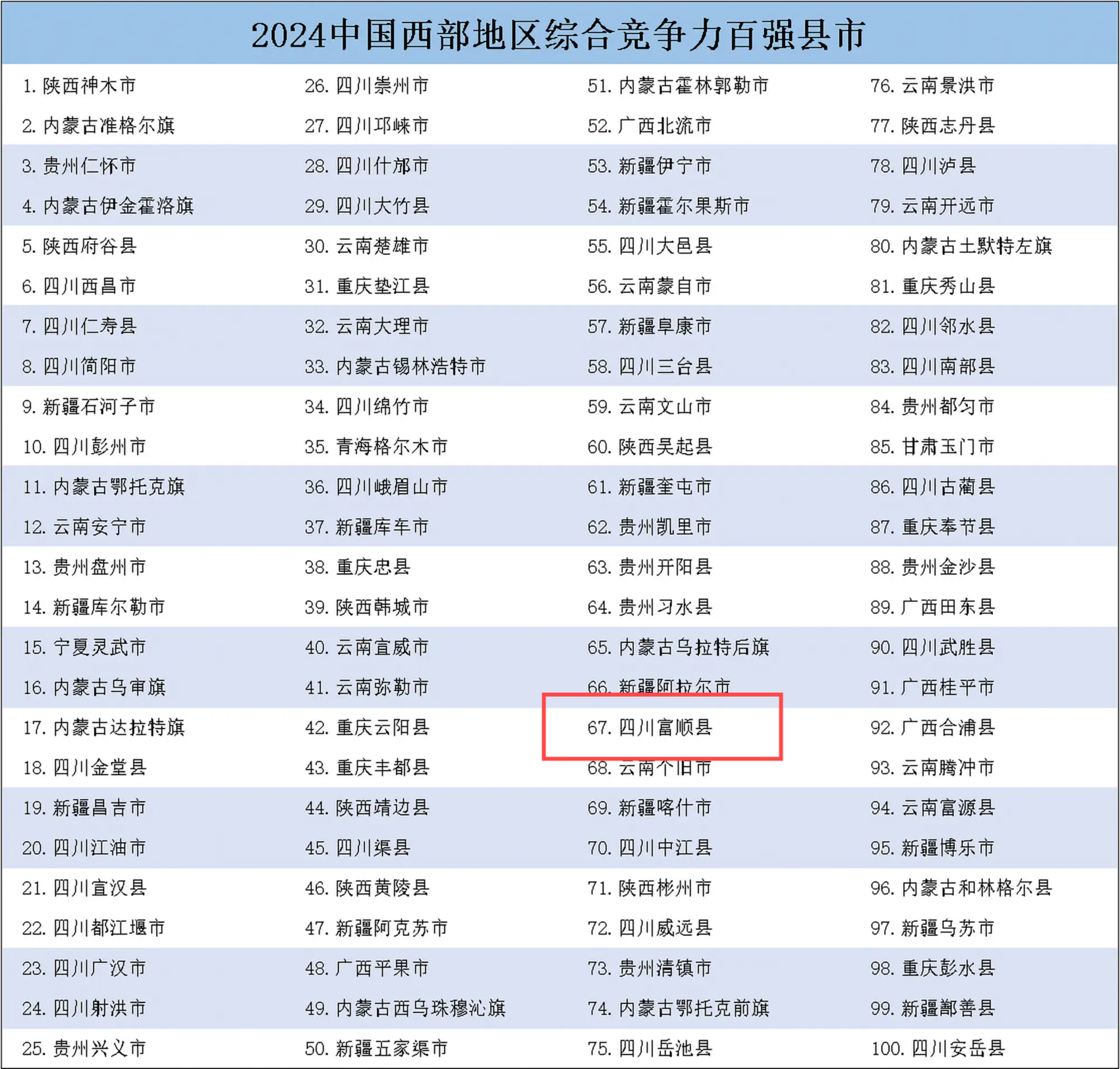 近日,记者从富顺县委宣传部获悉,竞争力智库、北京中新城市规划设计研究院等机构发布《中国西部地区县域发展监测报告2024》(简称《报告》),揭晓了2024中国西部地区综合竞争力百强县市名单。其中,自贡市富顺县榜上有名,排名67位,系四川29个上榜县域之一。