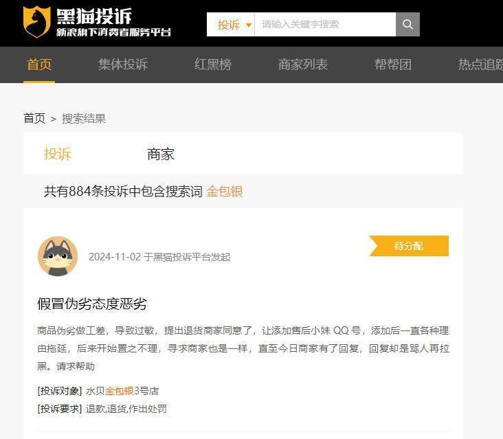 记者在黑猫投诉平台上搜索关键词“金包银”发现,截至11月5日,与该关键词相关的投诉已达884条。多数投诉与“假冒足金饰品”“掉色”“含金量不足”“虚假宣传”等问题相关。一资深黄金从业人员向记者表示,“金包银”饰品制造门槛较低,因此市场比较混乱,可以说鱼龙混杂,产品质量参差不齐。