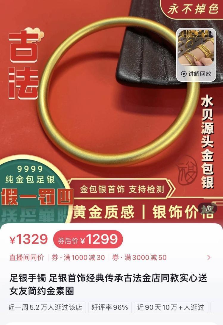 在另一视频购物平台,一家“金包银”饰品店铺销售的一款1299元总重量35克(含黄金1.8克)的金包银产品受到追捧,该店铺近一周有5.2万人浏览,超一千人加购。该店宣传称“黄金质感,银饰品价”“足金包足银,支持检测”。客服称,外表和纯金的一样,价格甚至不到纯金的十分之一。