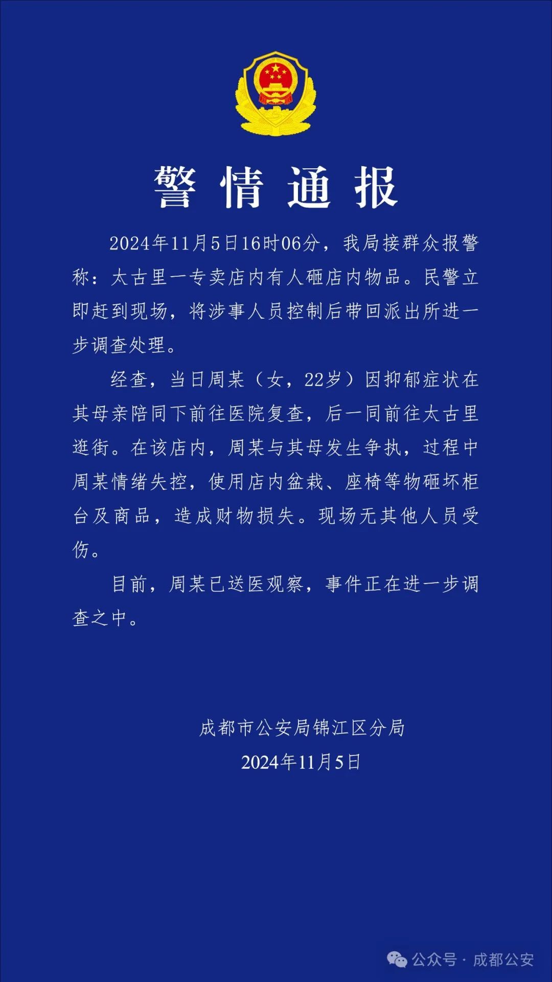 2024年11月5日,成都市公安局锦江区分局发布警情通报: