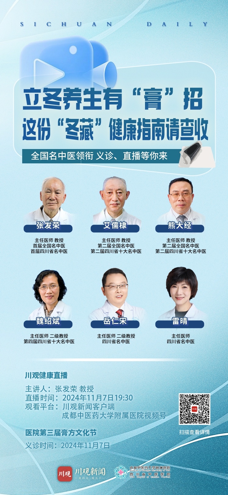 2024年11月7日—11月13日,成都中医药大学附属医院/四川省中医医院举办“膏方蓉城 和合共生”第三届膏方文化节。川观新闻携手成都中医药大学附属医院/四川省中医医院开展健康科普直播,邀请首届全国名中医、首届四川省名中医,就膏方的正确选用,冬季健康养生的内容,为大家科普答疑。