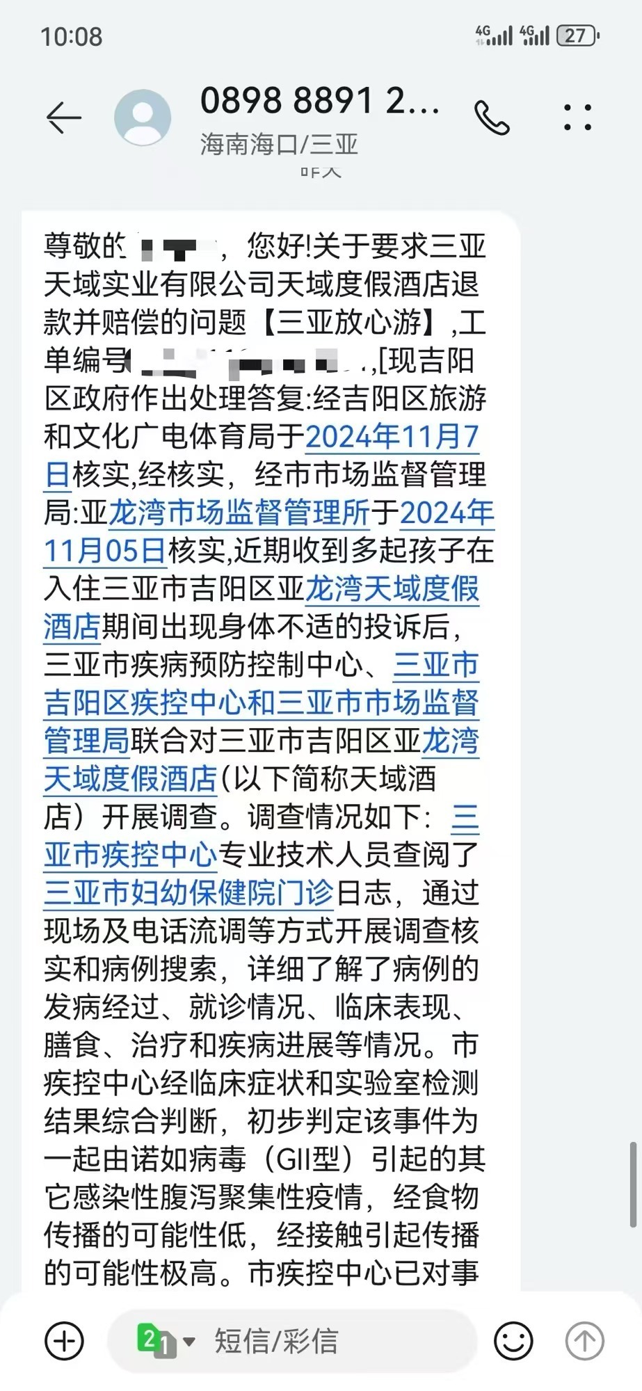 11月8日,王女士告诉澎湃新闻,7日她收到一则来自三亚市12345政务服务热线的短信回复。短信称,针对此前的相关投诉,经三亚市市场监督管理局亚龙湾市场监督管理所11月5日核实,近期收到多起孩子在入住三亚市吉阳区亚龙湾天域度假酒店期间出现身体不适的投诉后,三亚市疾病预防控制中心、三亚市吉阳区疾控中心和三亚市市场监督管理局联合对三亚市吉阳区亚龙湾天域度假酒店(以下简称天域酒店)开展调查。