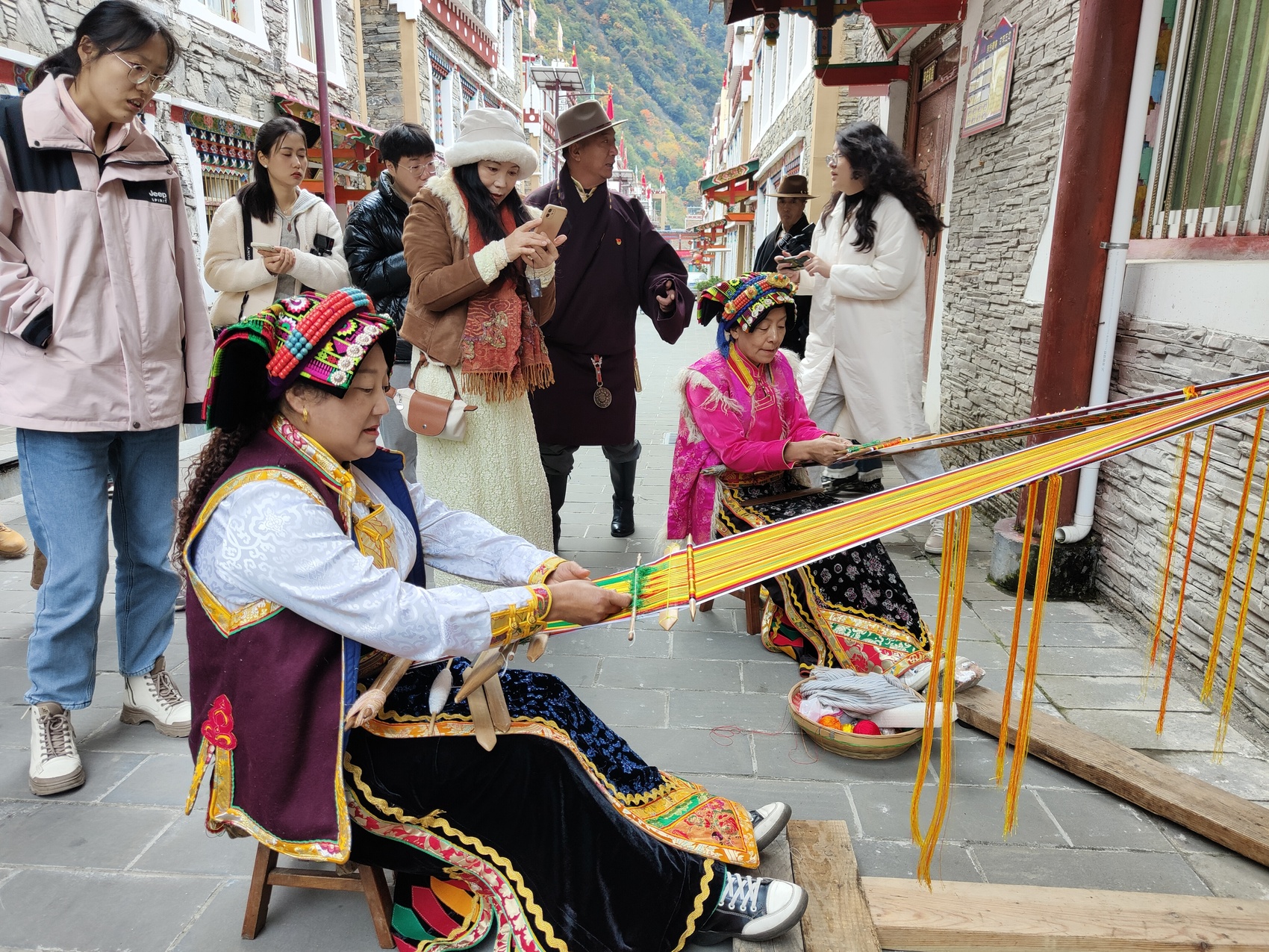 街道上,两位丘地村村民正在路边纺藏织腰带,吸引了游客围观。据悉,藏织腰带是当地藏族人结婚时佩戴的一种腰带。其中一位村民张琼说,“我们从小学习这门手艺,不忙的时候才会编,编织一条要花一个星期。”