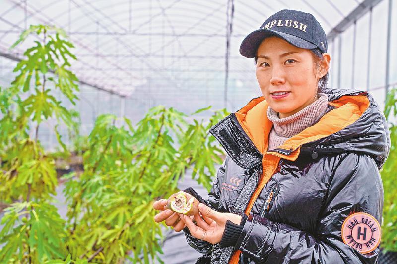 12月18日,四川省美源润生态农业发展有限公司内,员工展示大棚内培育的无花果。唐广摄
