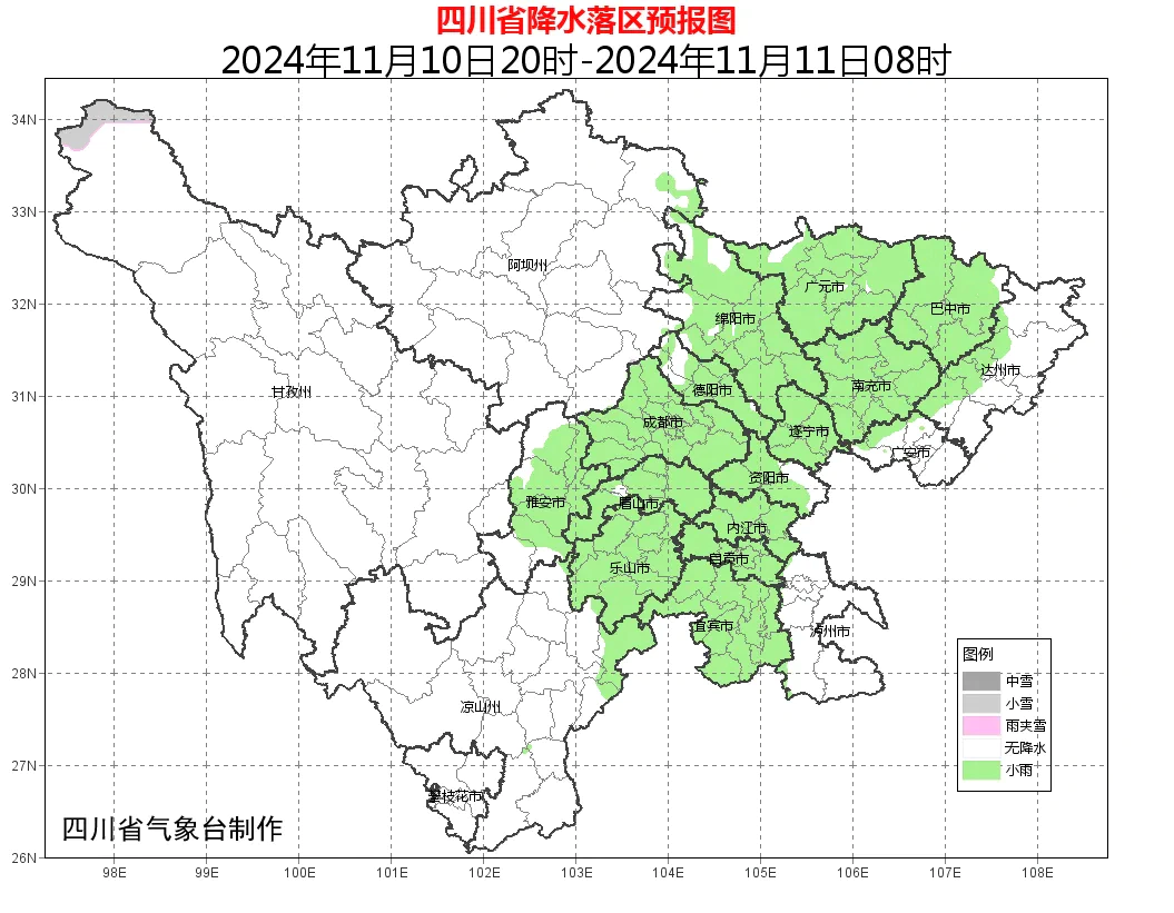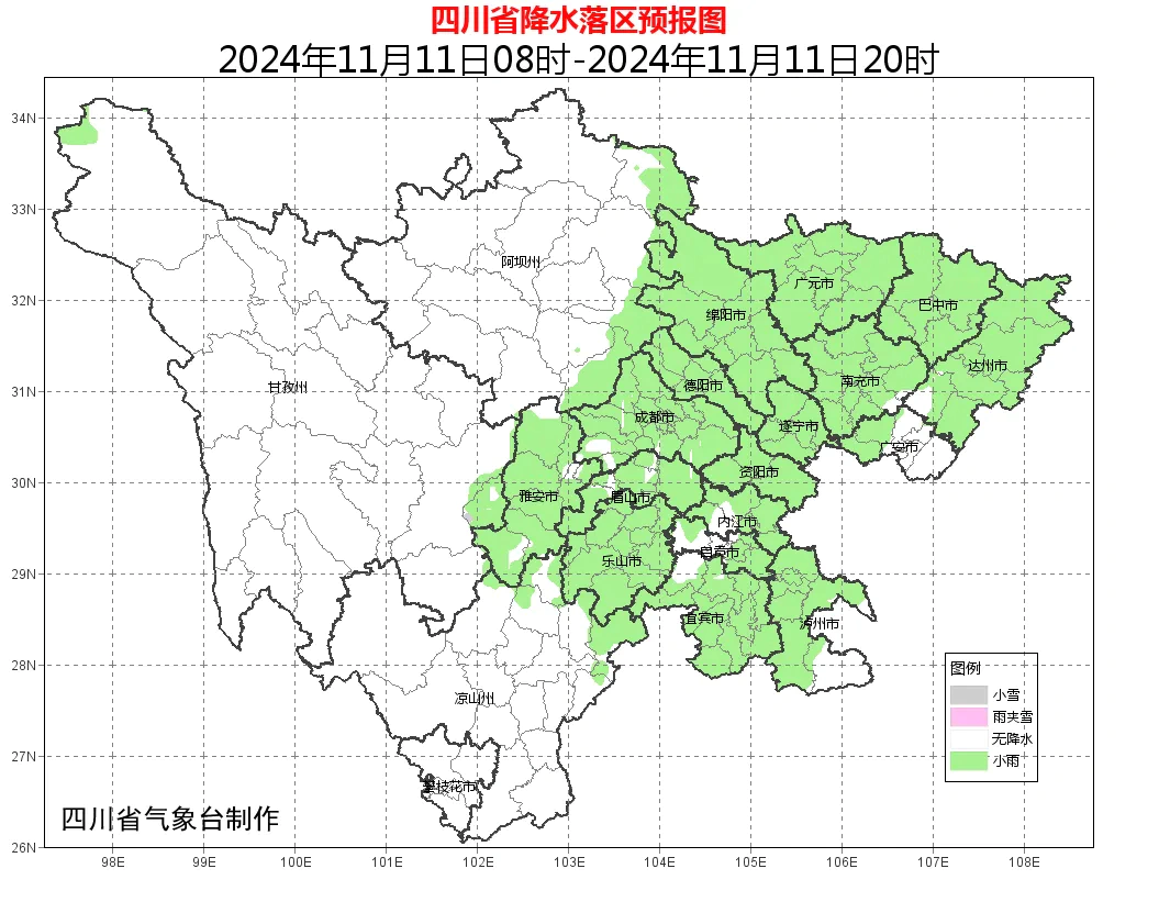 明天白天:盆地各市阴天有小雨或零星小雨;川西高原和攀西地区以晴间多云天气为主,其中凉山州东北部局地有分散阵雨。