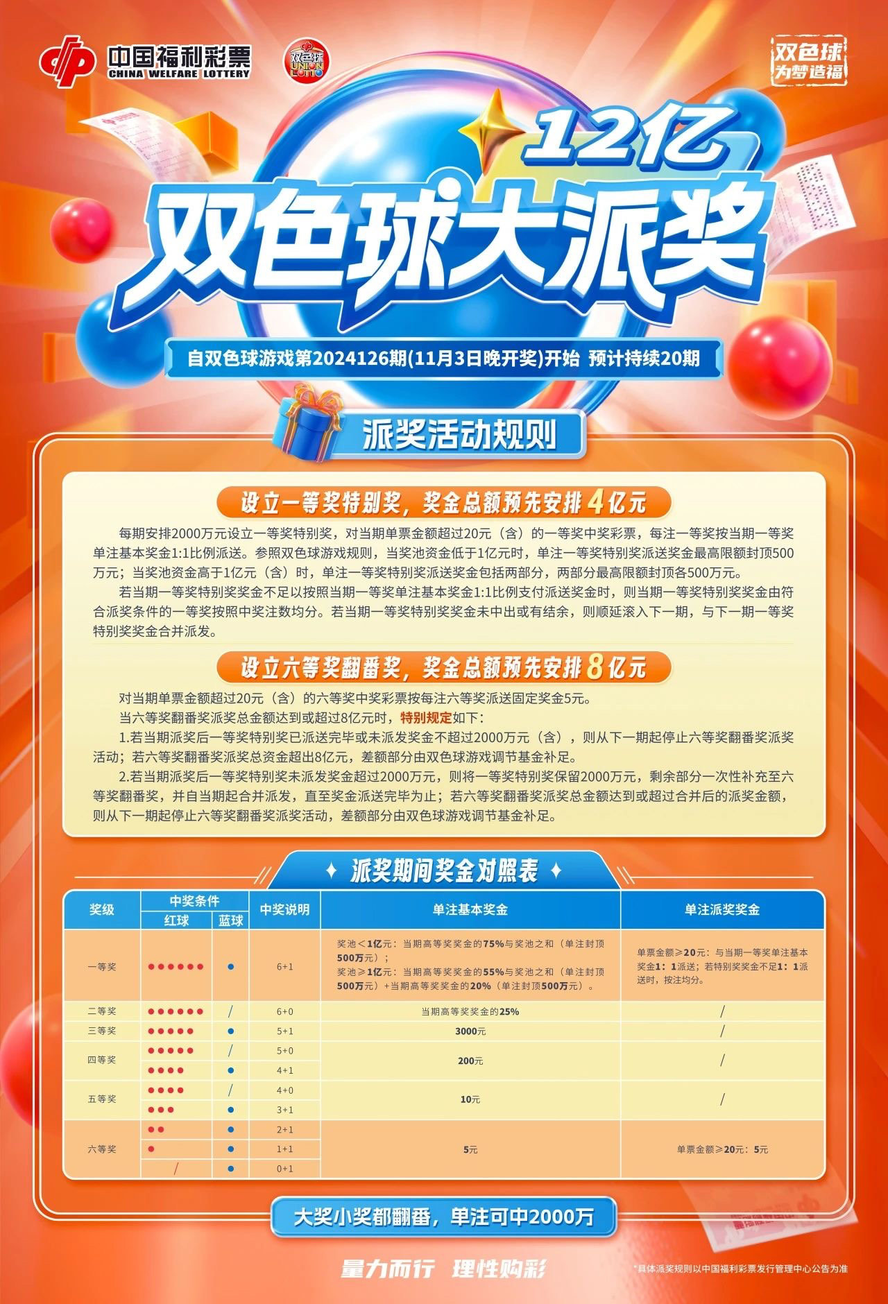 一等奖特别奖,奖金总额预先安排4亿元六等奖翻番奖,奖金总额预先安排8亿元