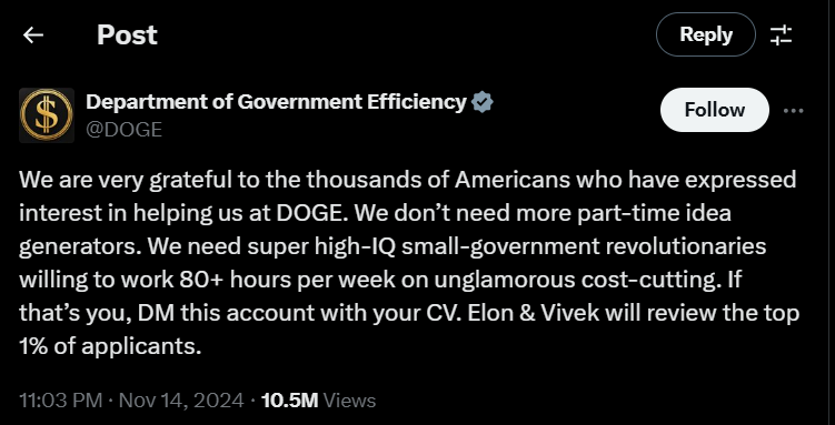 “我们非常感谢成千上万表示有兴趣帮助我们‘政府效率部’(DOGE)的美国人。我们不需要更多兼职的创意创造者,而是需要超高智商的小政府改革者,并愿意每周工作80小时以上,专注于枯燥的成本削减工作。”这则招聘启事写道,“如果你是这样的人,请将简历直接发送给本账号。埃隆和维韦克将对前 1%的申请者进行审核。”