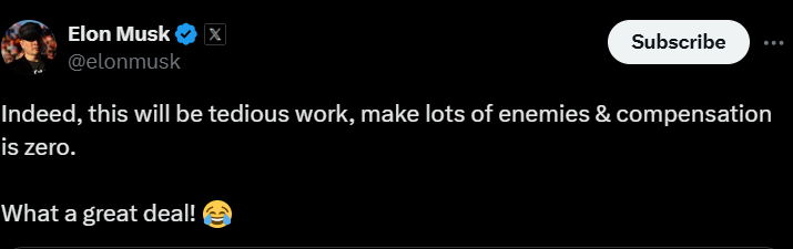 马斯克还发帖补充道,“的确,这将是一项乏味的工作,树敌很多,报酬为零。多划算!”他还在文末附上了一个“笑哭”的表情。