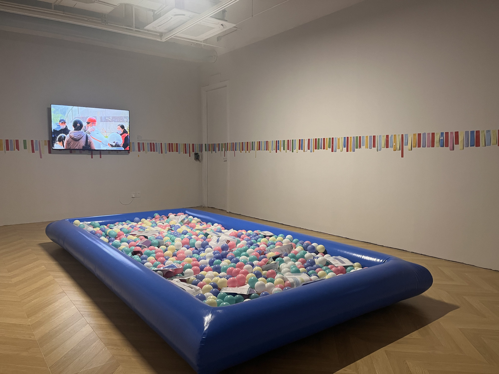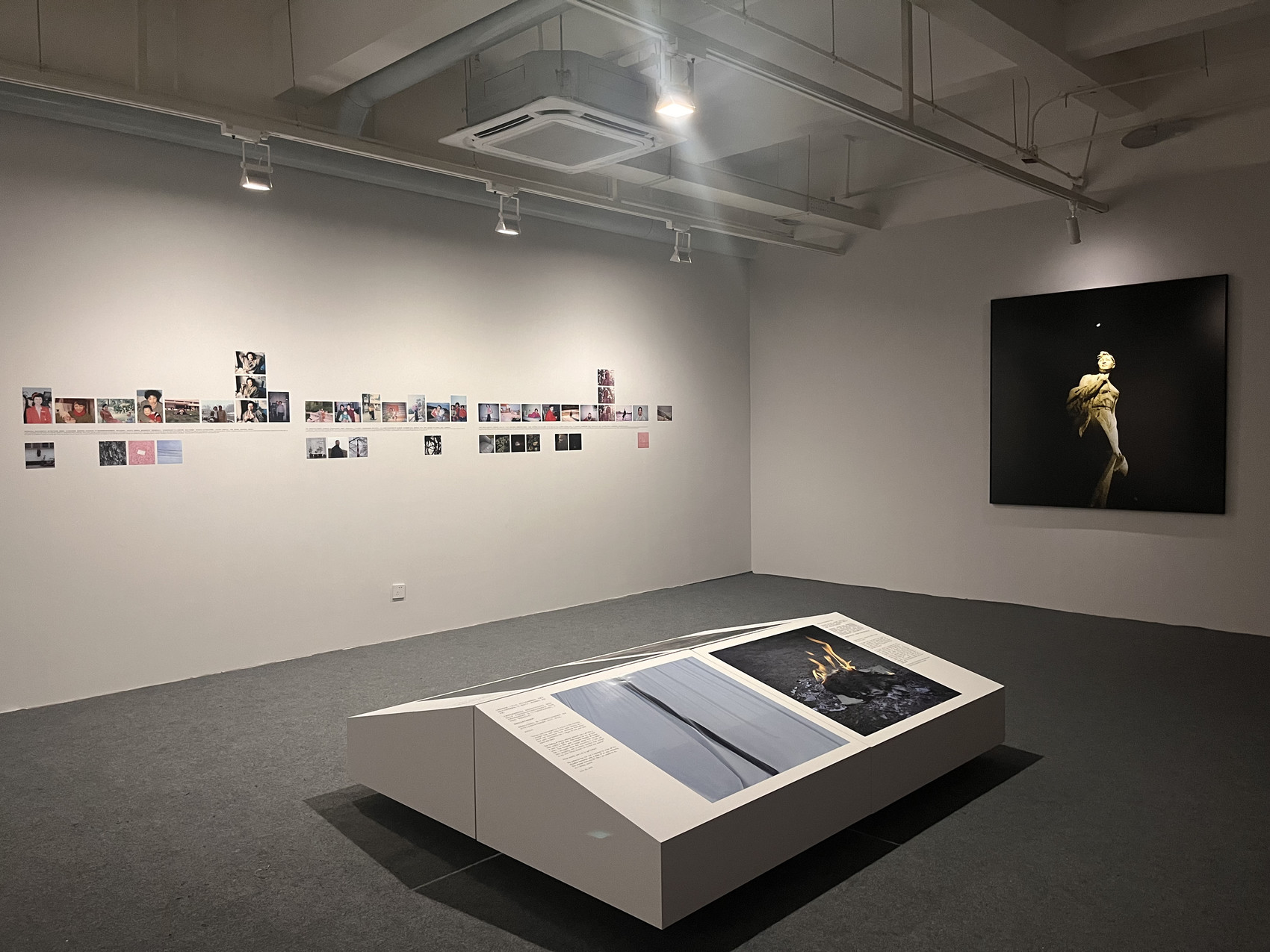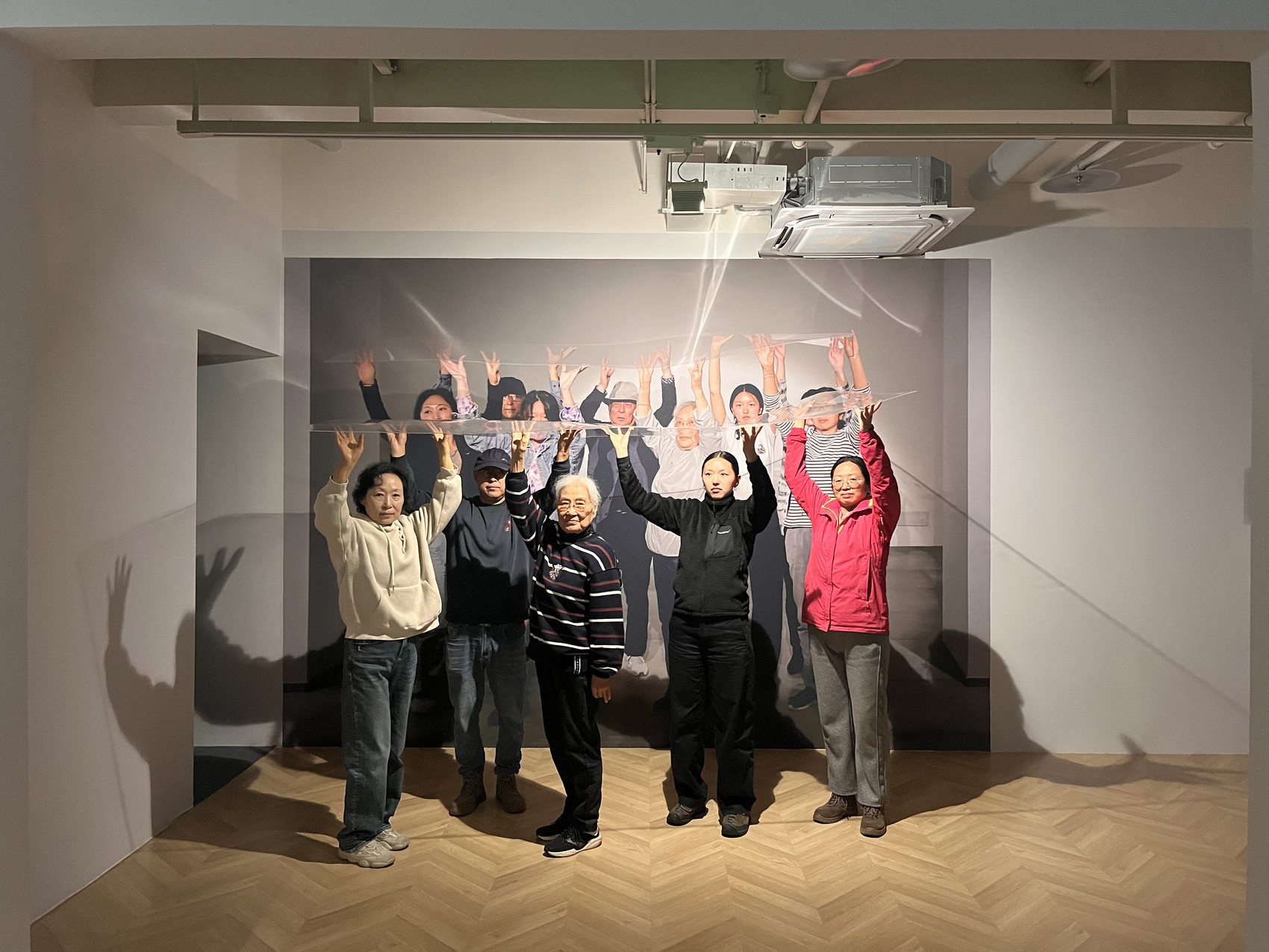 于名晶的作品名为《举一片玻璃》。2019年,她邀请在成都的所有家人一道,在成都一家美术馆共同举起一块透明的亚克力板,并以照片和视频对此过程进行了记录。此次展览,其中部分家人再次来到现场,与她一起重现了5年前的场景。“一开始的时候,可能是因为血脉和家人的关系,让他们必须要支持我,参与到我的作品里面来。然后在参与的过程中,我觉得他们也感受到了一些什么,也有了一些变化。”在于名晶看来,“我的家庭不只是我的家庭,也是每个人的家庭;这里面的作品不只是每个艺术家的作品,也代表了每个人的记忆,每个人的童年。我觉得在这些个体经验中,每个人都能够有很深的感受。”