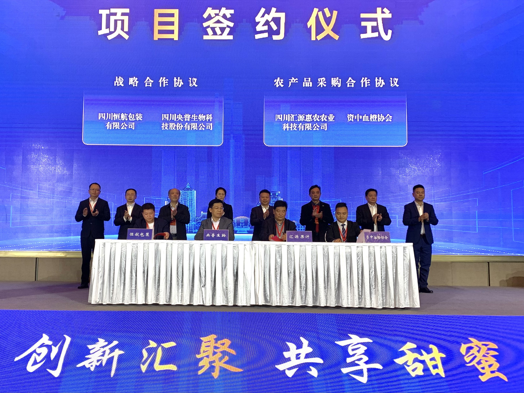 当天的重磅签约议程,分别是四川央普生物科技股份有限公司(以下简称“央普生物”)与重庆市恒航包装股份有限公司签订战略合作协议,四川汇源惠农农业科技有限公司与资中血橙协会签订农产品采购战略合作协议。