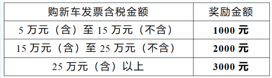 (一)购新车消费奖励。对活动期间购买家用乘用新车(含燃油汽车和新能源汽车)的个人消费者,发放购新车消费奖励,具体标准为: