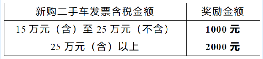 (二)新购二手车消费奖励。对活动期间在符合条件的二手车经销企业新购二手乘用车(含燃油汽车和新能源汽车)的个人消费者,发放新购二手车消费奖励,具体标准为: