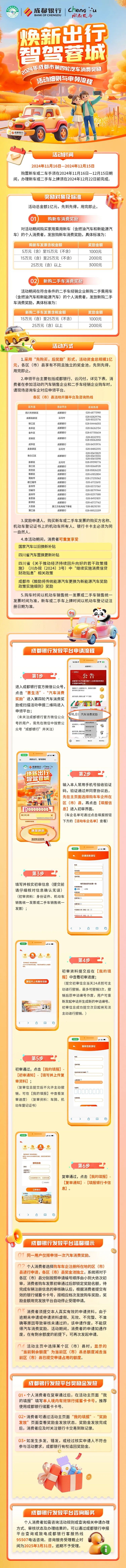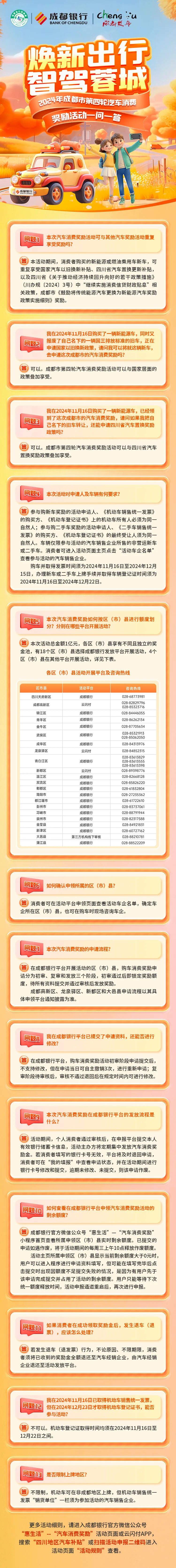 本活动期间,消费者购买新能源或燃油乘用车新车,可重复享受四川省《关于推动经济持续回升向好的若干政策措施》(川办规〔2024〕3号)中“继续实施消费信贷财政贴息”相关政策,以及国家汽车以旧换新补贴、四川省汽车置换更新补贴、成都市《鼓励将传统能源汽车更换为新能源汽车奖励政策实施细则》奖励。