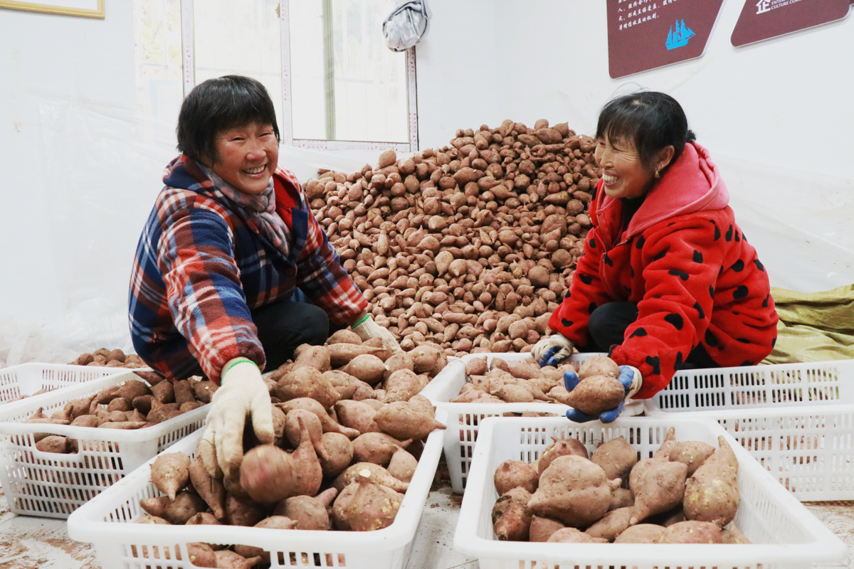 安居现代红薯产业园内,村民正在分拣红薯