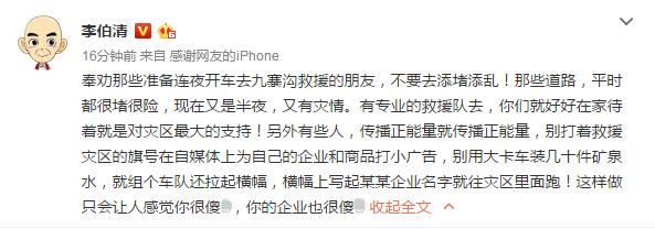 8月8日晚,巴蜀笑星李伯清发微博呼吁:不要去九寨沟添堵添乱,好好在家待着就是对灾区最大的支持。