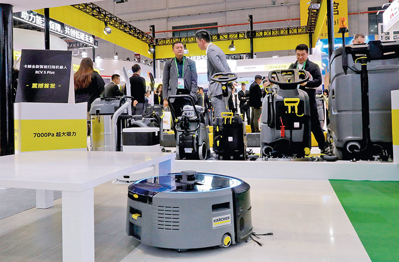 一台卡赫全新智能扫拖机器人 RCV 5 Plus(前)在第七届中国国际进口博览会上进行作业演示。