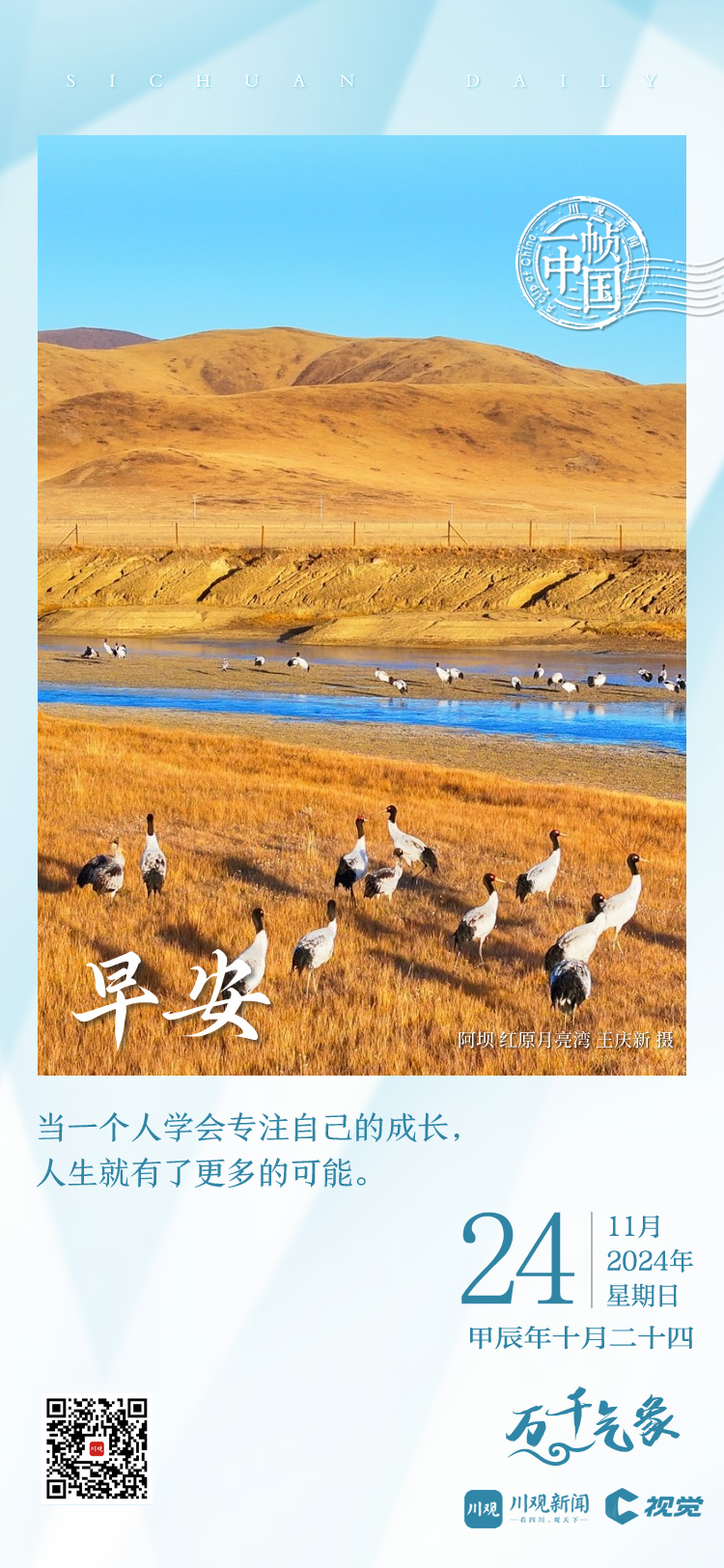 今天的《一帧中国》,川观新闻带你来到阿坝州红原县月亮湾湿地,邂逅准备南迁的“高原精灵”黑颈鹤。河流碧波荡漾,草原满目金黄,黑颈鹤翩翩起舞,觅食嬉戏,为高原湿地增添了灵动之美。
