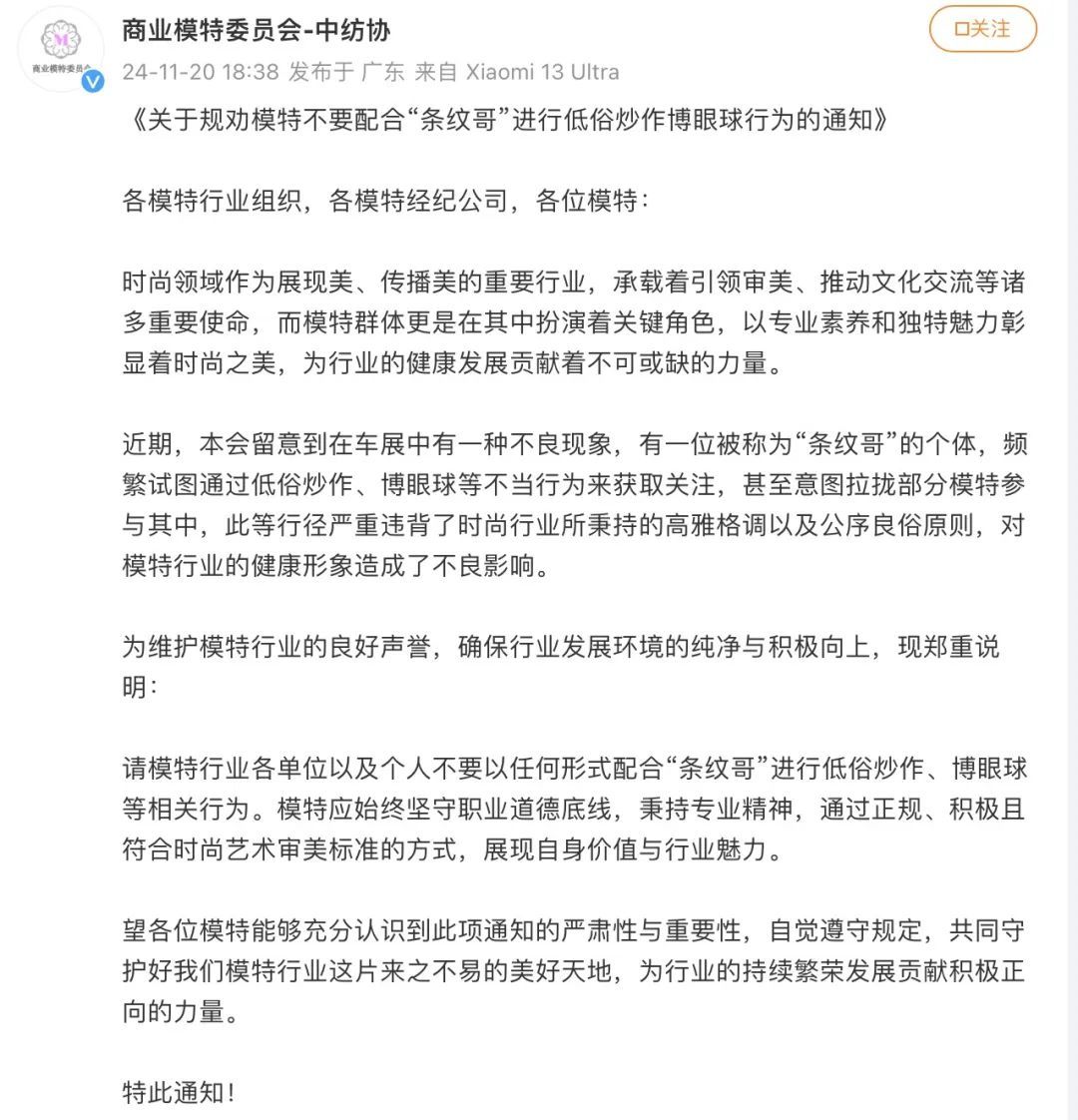 11月20日下午,中国纺织品商业协会商业模特委员会官方微博@商业模特委员会-中纺协 发布《关于规劝模特不要配合“条纹哥”进行低俗炒作博眼球行为的通知》称,近期,该会留意到在车展中有一种不良现象,有一位被称为“条纹哥”的个体,频繁试图通过低俗炒作、博眼球等不当行为来获取关注,甚至意图拉拢部分模特参与其中,此等行径严重违背了时尚行业所秉持的高雅格调以及公序良俗原则,对模特行业的健康形象造成了不良影响。