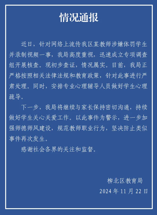 11月22日,“小学生吃零食被老师打脸,老师还自己录视频发出来”的视频在网上引发关注。广西柳州柳北区教育局通报,近日,针对网络上流传柳北区某教师涉嫌体罚学生并录制视频一事,教育局高度重视,迅速成立专项调查组开展核查。现初步查证,情况属实。目前,教育局正严格按照相关法律法规和教育政策,针对此事进行严肃处理。同时,安排专业心理辅导人员做好学生心理疏导。