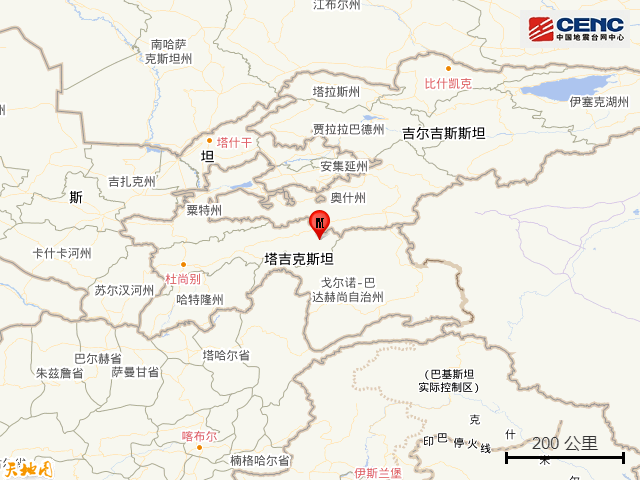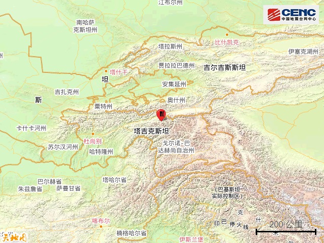 据中国地震台网正式测定,11月23日16时33分在塔吉克斯坦发生5.0级地震,震源深度10公里,震中位于北纬39.10度,东经71.80度,距我国边境线最近约148公里。